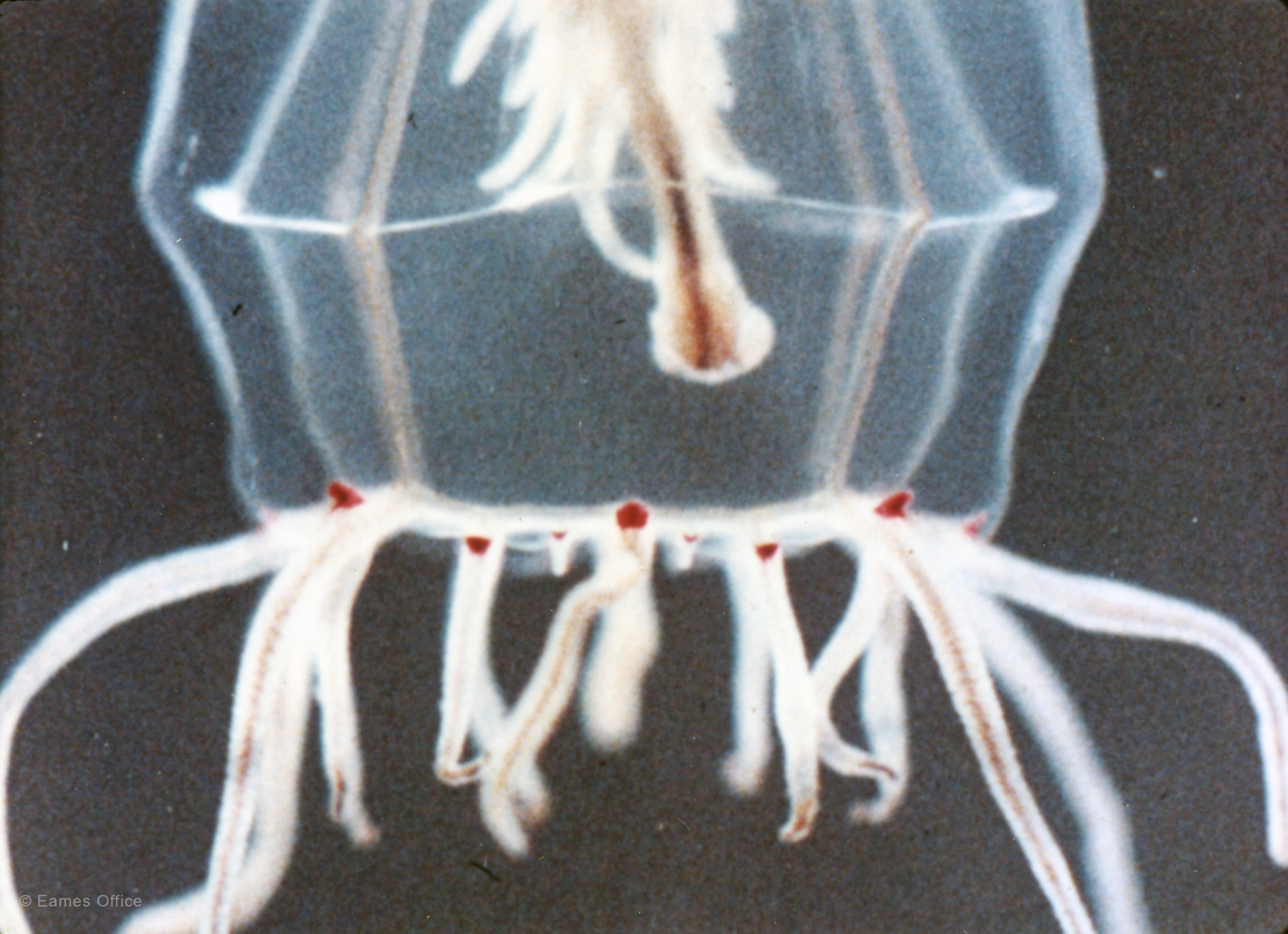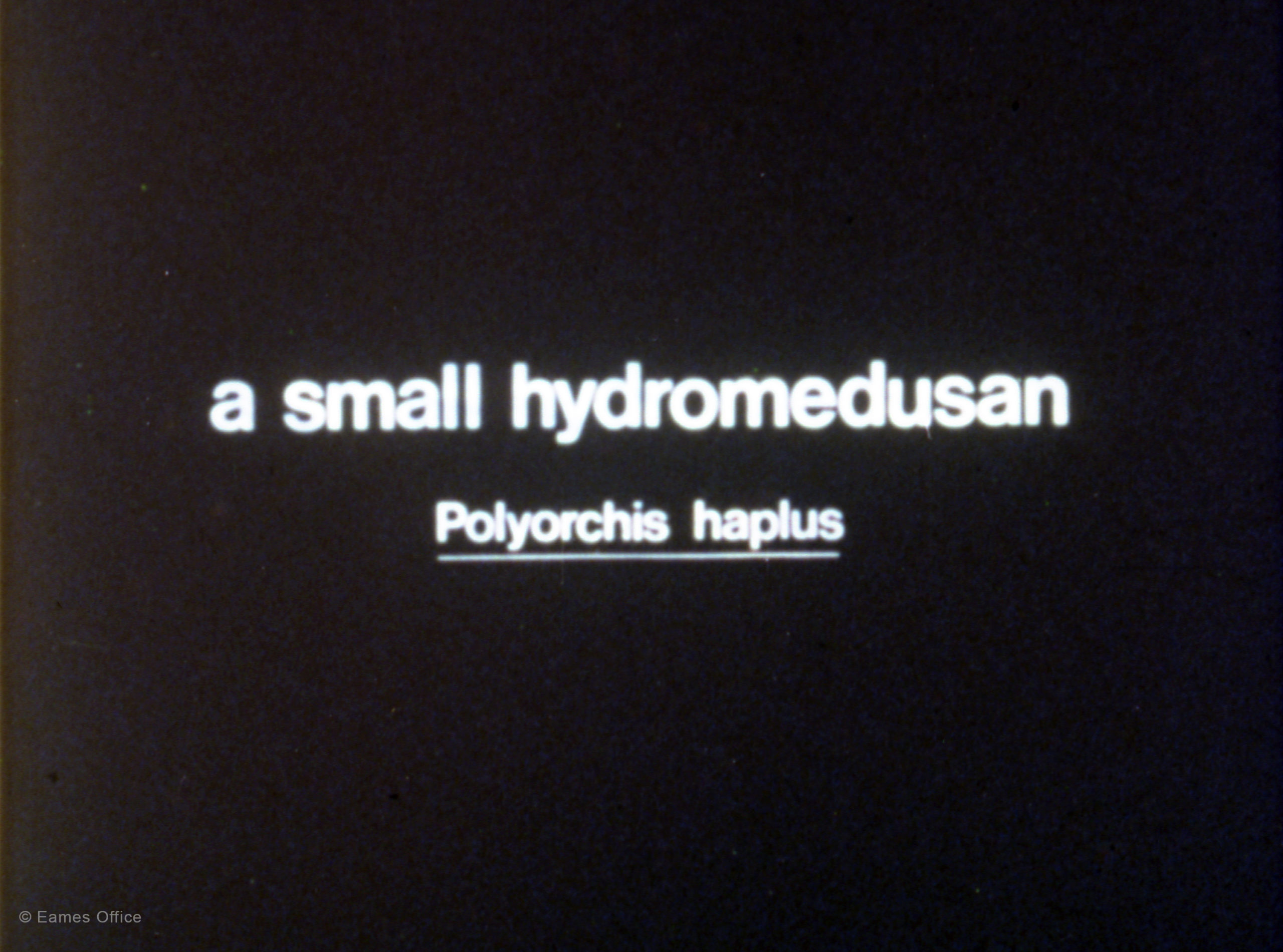 A live-action film of a rare sea creature. The tiny transparent life form (only 5/8″ high) has only rarely been observed in its natural habitat. The remarkable Eames macro-photography provides an intimate view of the animal, and demonstrates the creature’s symmetrical shape and its movement in the water.