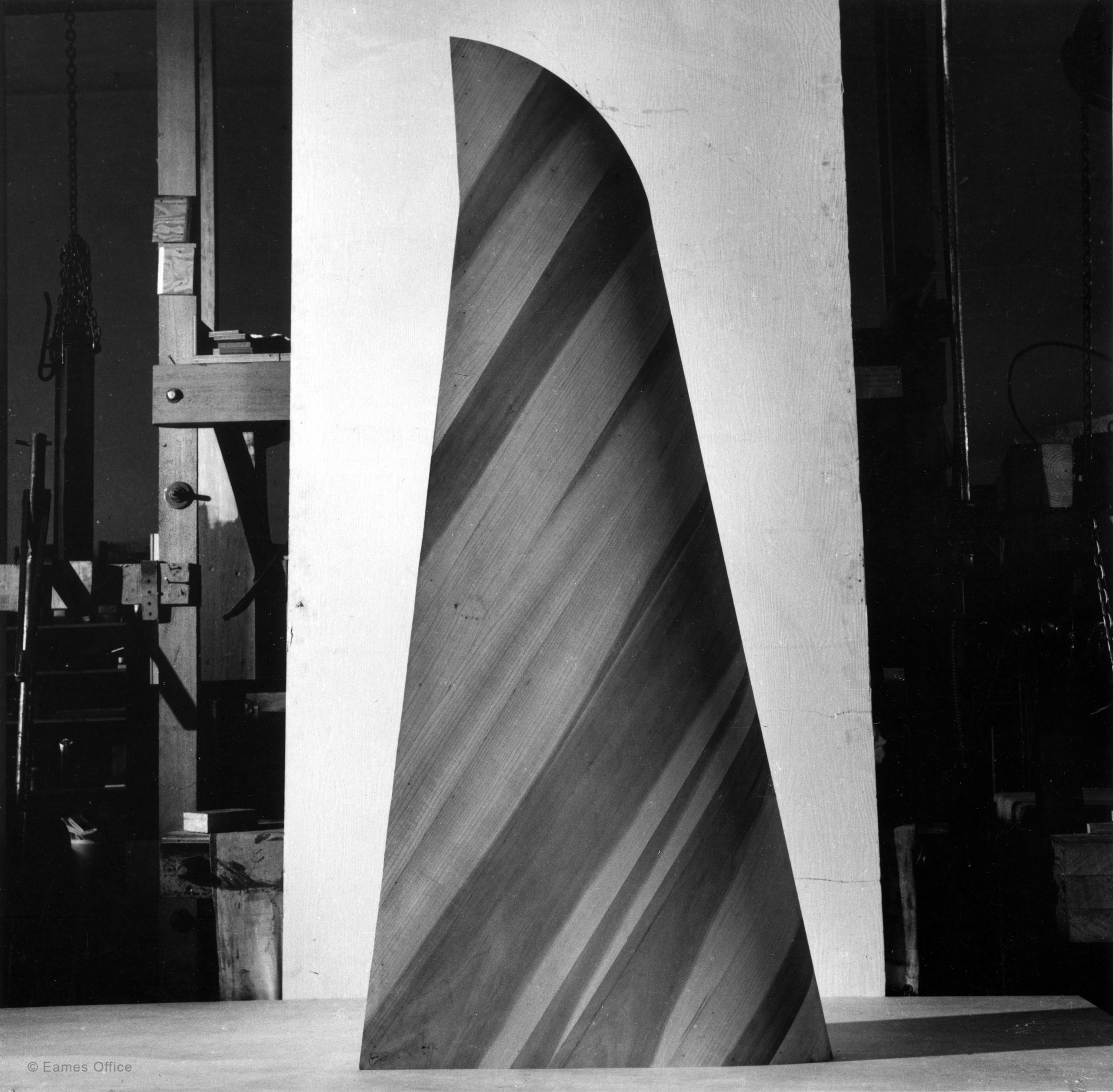 The Eameses had to create larger, more complex versions of their original “Kazam! machine” as well as new tooling made to prescribed aircraft specifications. They also found that forming the large plywood sections required a tremendous amount of pressure and precise control over factors such as humidity and curing times. Charles and Ray’s success with aircraft parts was what they often called a learning-by-doing process. Ultimately, it assisted them in their ongoing quest to create high-quality, low-cost molded plywood furniture.