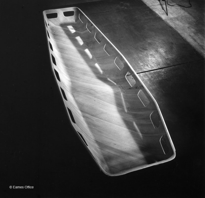 In 1942, the Eameses pondered how molded plywood could address a serious problem the Medical Corps was struggling to solve: The standard metal splints used to brace wounded World War II servicemen were causing further injuries due to the vibrations in the metal during transport. Within one year, Charles and Ray produced their first Molded Plywood Splint using a wood-bending contraption they invented known as the Kazam! machine .