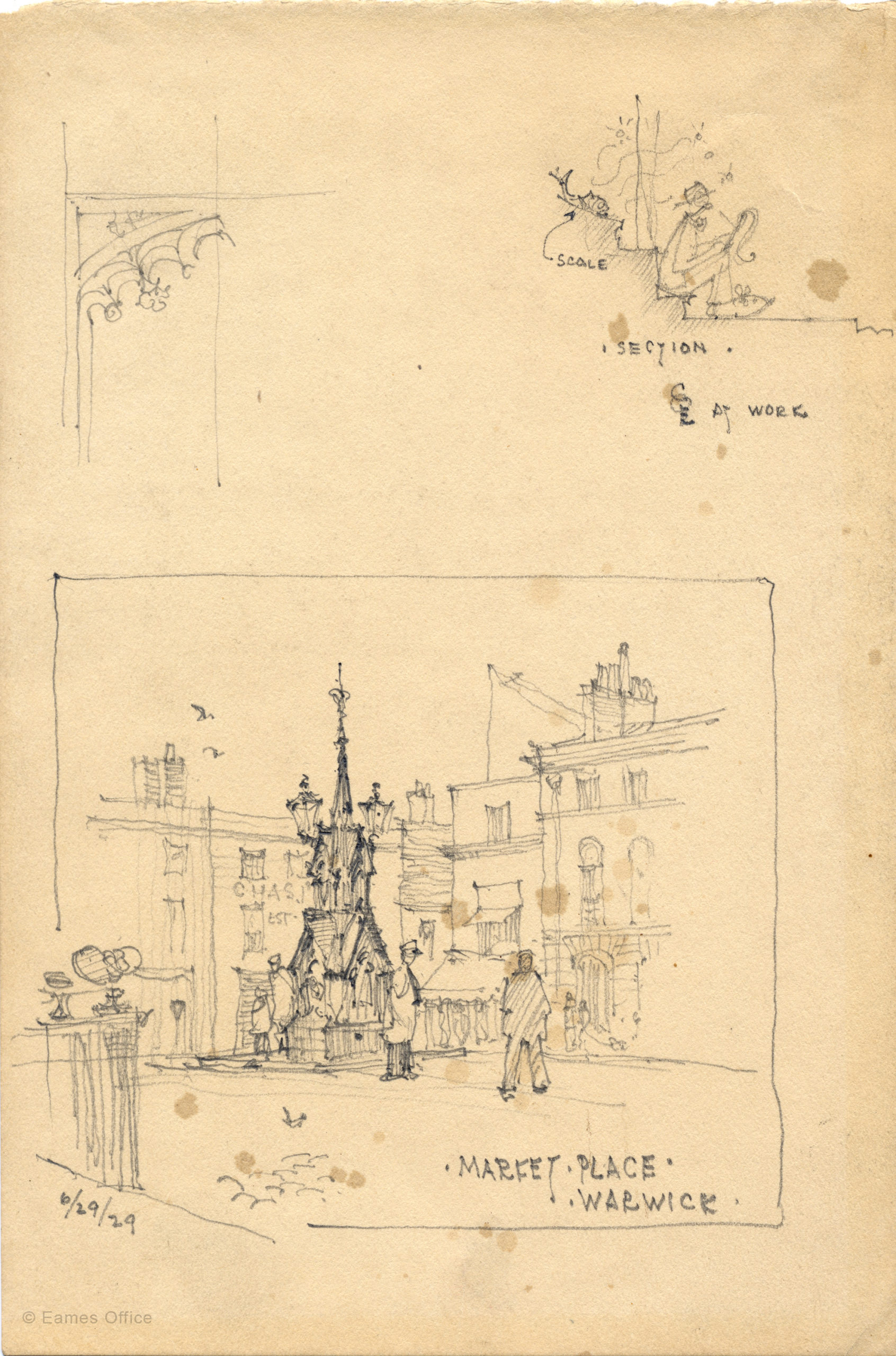 These three sketches serve as examples of the drawings Charles made on his extended honeymoon with his first wife, Catherine Dewey Woermann, a fellow architecture student at Washington University. The newlyweds spent several months in Europe in 1929 visiting centuries-old architecture and the more recently-built modernist buildings.