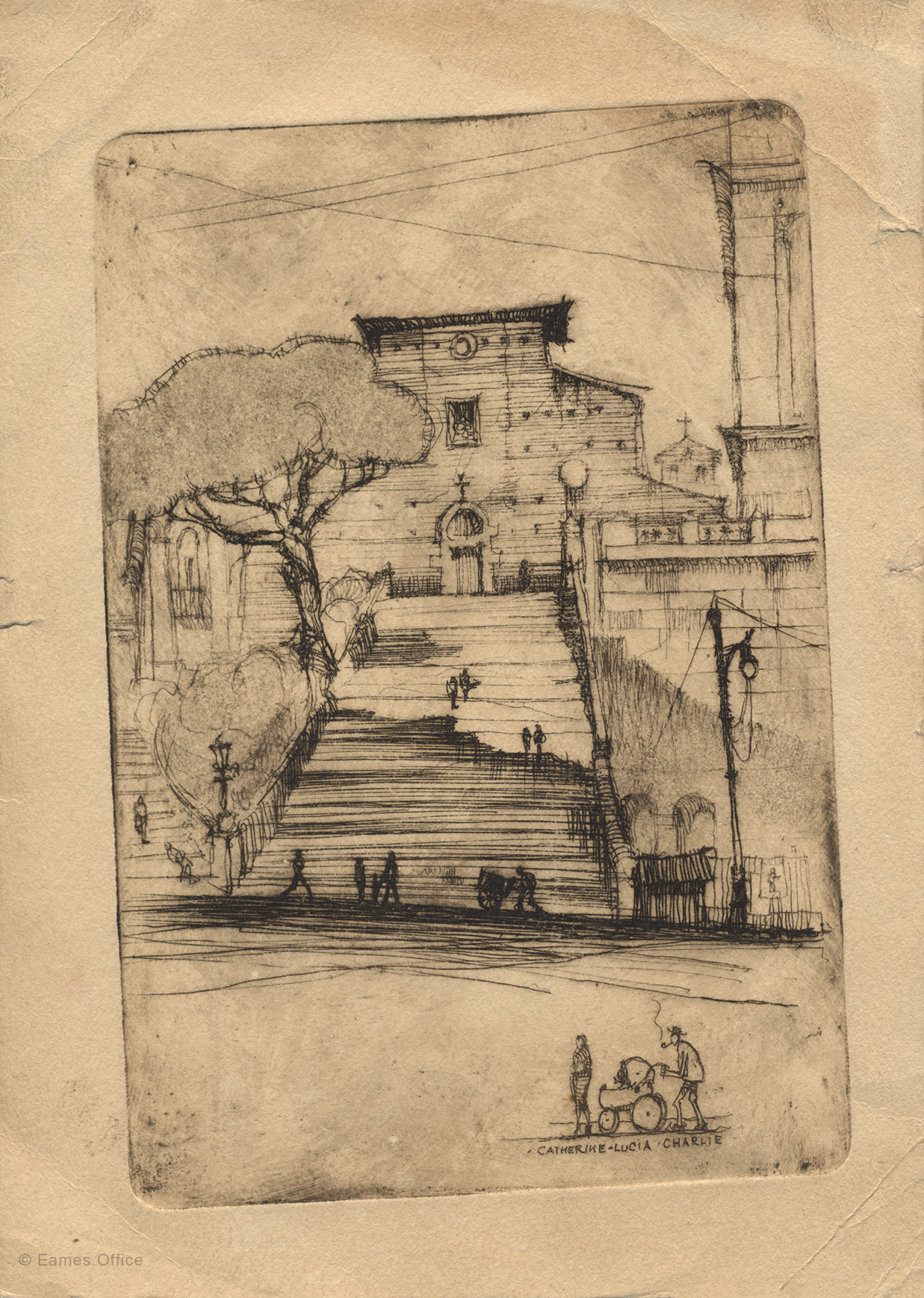 These two sketches serve as examples of the drawings Charles made on his extended honeymoon with first wife, Catherine Dewey Woermann, a fellow architecture student at Washington University. The newlyweds spent several months in Europe visiting centuries-old architecture as well as more recent modernist buildings.