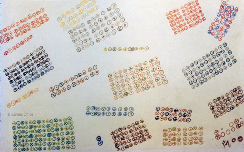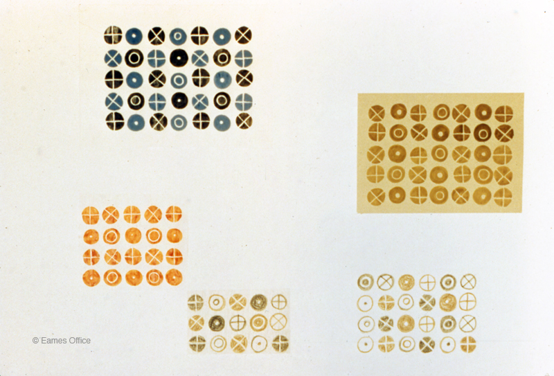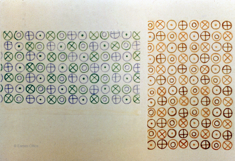 In 1947, Charles and Ray separately entered The Competition for Printed Fabrics sponsored by the Museum of Modern Art. The museum’s Department of Industrial Design organized the contest with jurors including architect Marcel Breuer, the Managing Editor of ART NEWS, and directors of multiple MoMA departments. Out of nearly 2,500 entries, four winners and fifteen honorable mentions were awarded cash prizes, a traveling exhibition, and the production of the textiles. “Circles” did not win Ray any awards during jurying, however, Lucia Eames and Mary Murphy of Maharam resurrected the pattern from Ray’s original drawings and transformed into a cotton/polyester textile in 1999. The design is still produced and loved today.