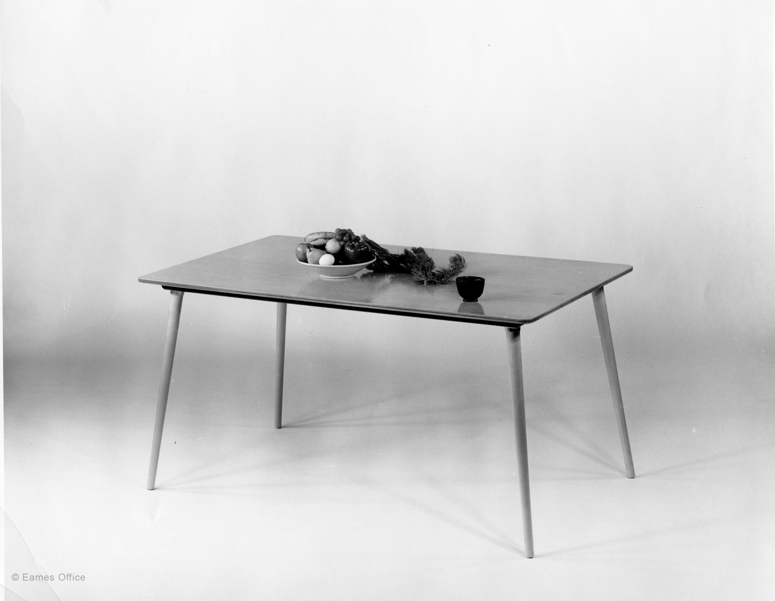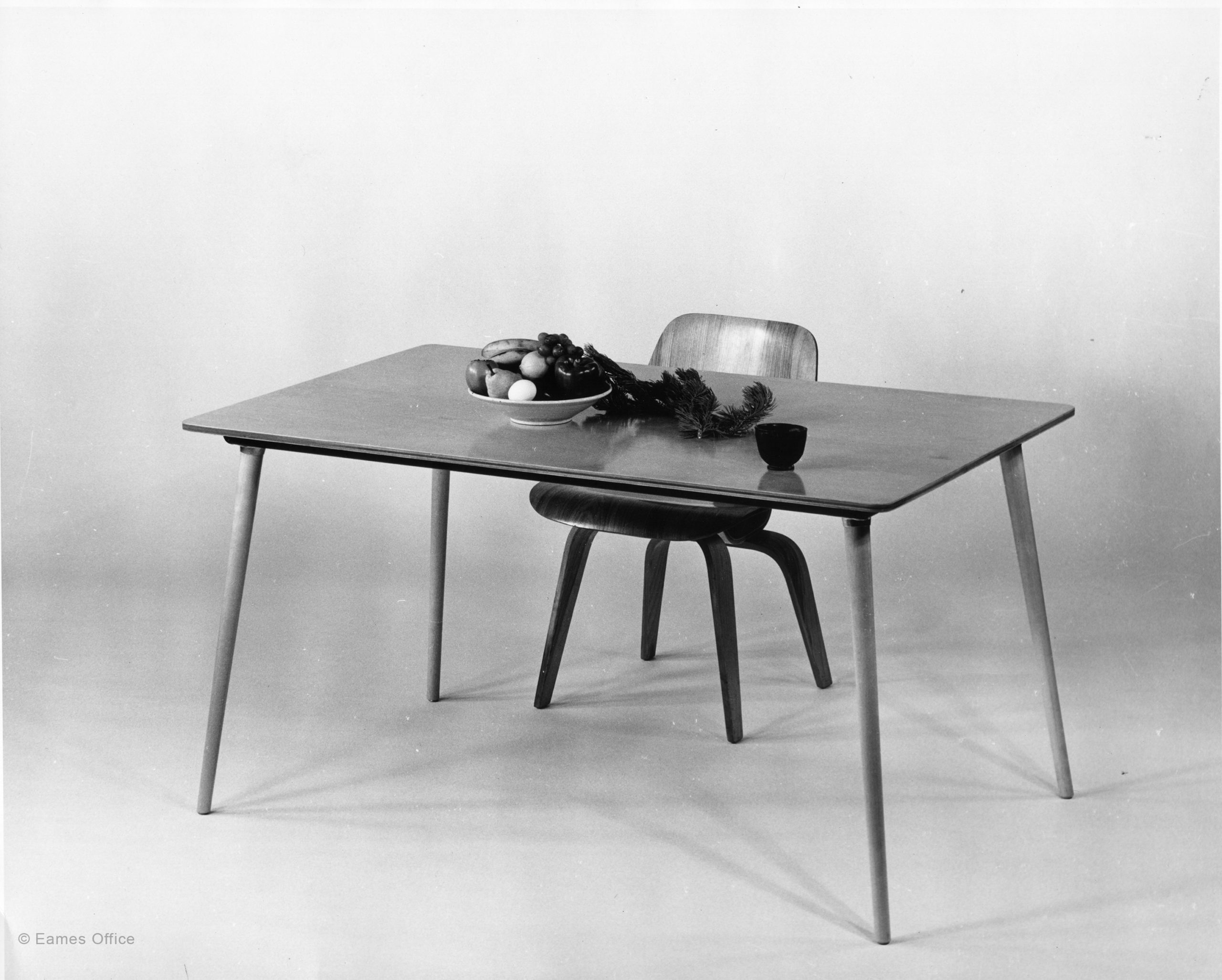 Charles and Ray developed the Eames Dowel Leg Table as a product of their process of developing their molded plywood chairs. Starting in 1950, the dowel leg tables were available in two different sizes as dining and as card or extension tables, and in one size, square, as a coffee table. Long before flatpack furniture became commonplace in the furniture industry, Charles and Ray designed what was once called“ knockdown furniture,” furniture that could be shipped flat. These dowel tables were the third of three concepts for knockdown tables; the others are the folding leg tables and the bent plywood leg tables.