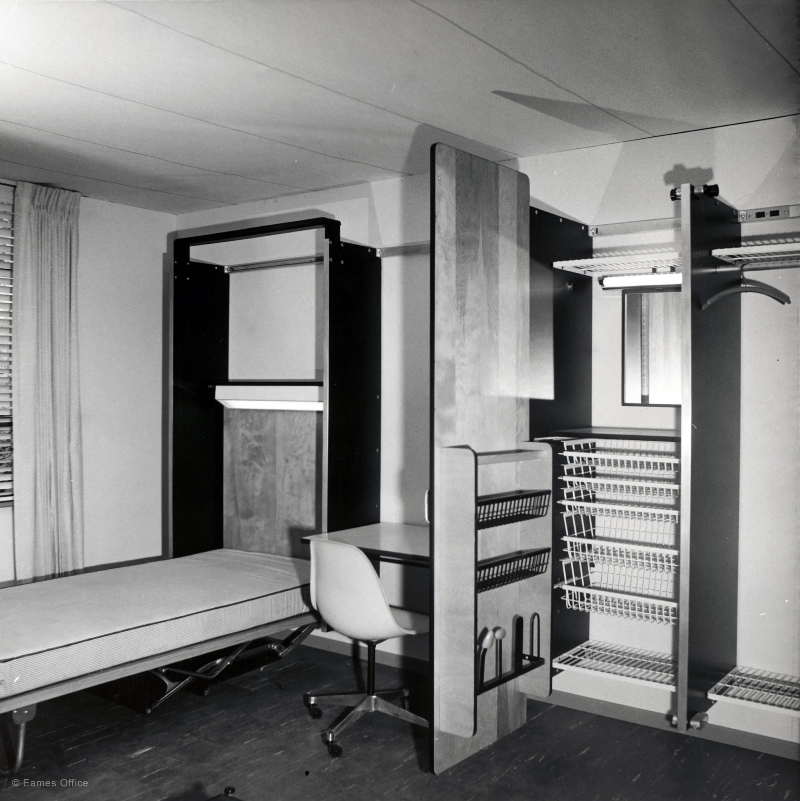 Charles and Ray devised beds that folded down for sleeping and up into their system wall in the daytime to provide more floor space. Additionally, it had a study center, with built-in lighting, a desktop with scratch and burn resistant hard plastic, shelves, drawers, a file basket, and a cork bulletin board. Thus, even rooms with more than one bed could allow an individual student workspace without disturbing others. The ECS units are beautiful, with expanses of premium face veneer on the surfaces. The metal parts are solid cast, and the wire shelves and vertical dividers are coated in rubber for added durability.