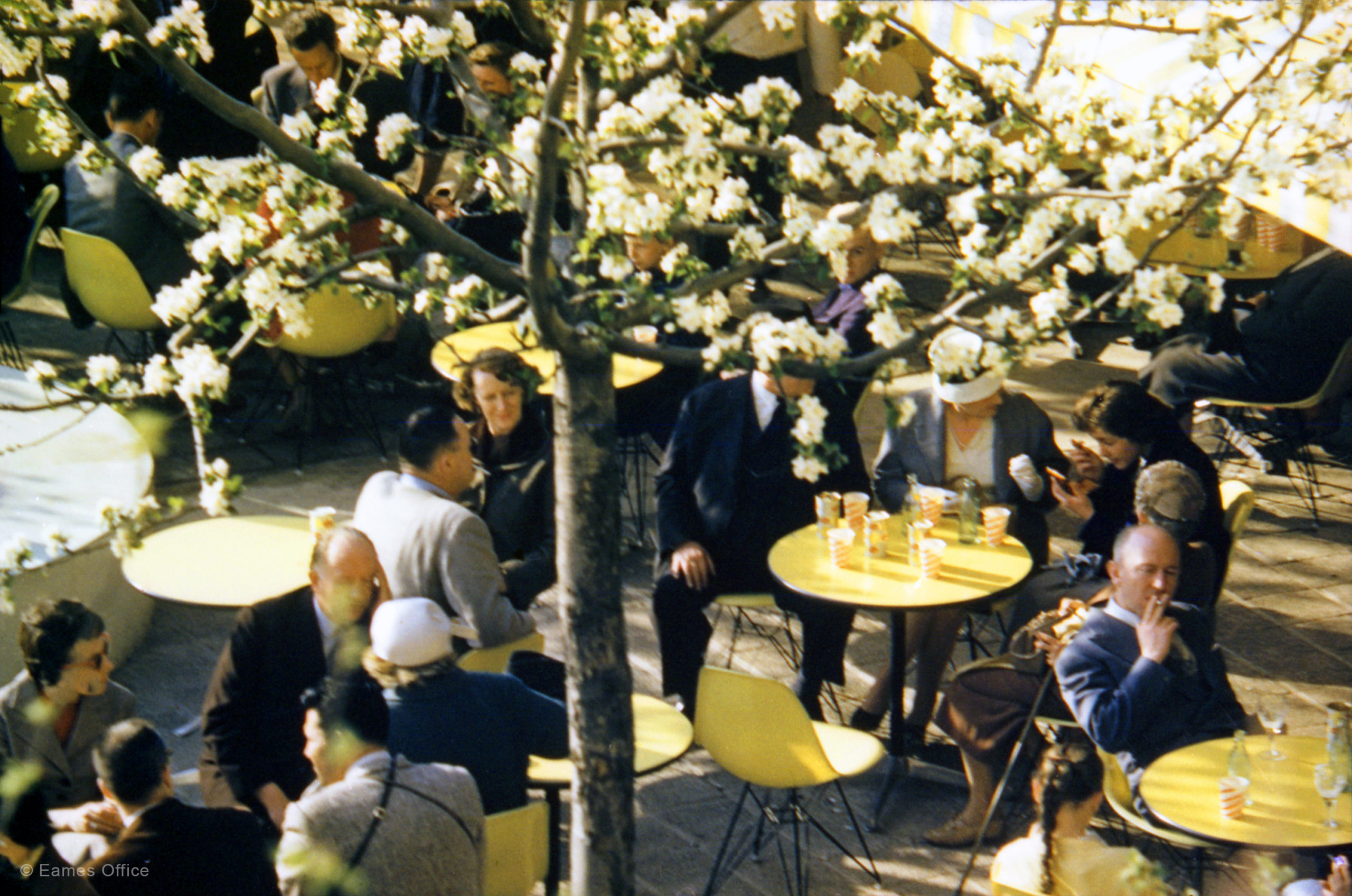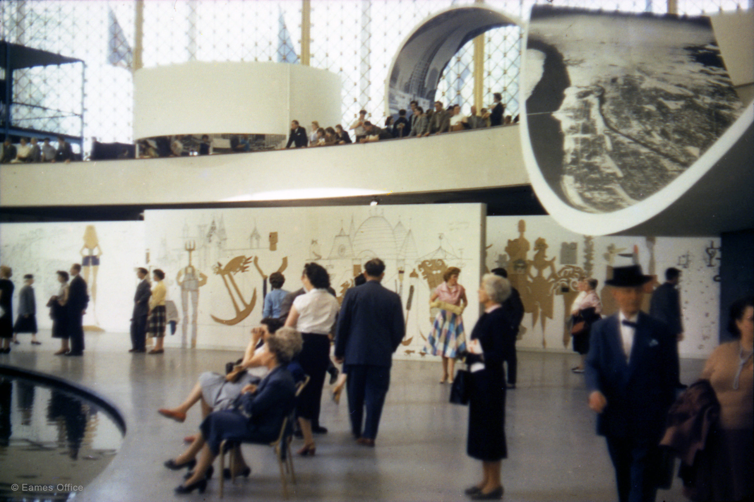 A film documenting the IBM Pavilion at the 1958 Brussels World’s Fair which featured both Eames furniture and the Eames film The Information Machine. The film highlights murals by Saul Steinberg which decorated the pavilion, along with visitors relaxing on the Herman Miller chairs. Presented without narration, but with lively music by the Herbie Mann Sextet, Chet Baker, and The Wind.
