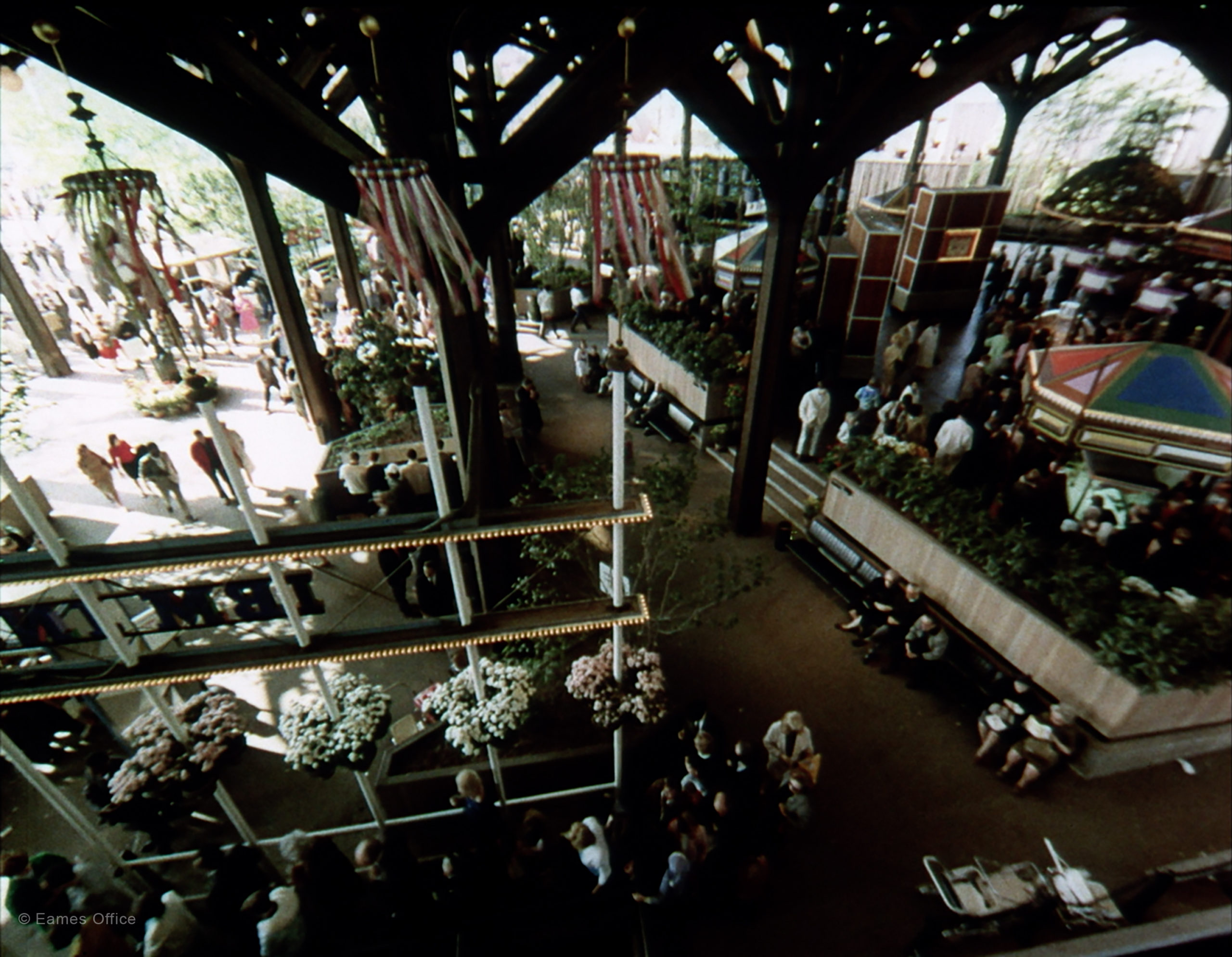 A film record of the Eames-designed IBM Pavilion at the 1964-65 New York World’s Fair. Fast-cutting and time-lapse photography create a high-speed montage of visitors moving through the various attractions in the pavilion, revealing patterns of movement not apparent in real-time footage. There is a glimpse of The People Wall being lifted into the Ovoid Theater, where the multiscreen film Think was shown. The pace is lively, and a sense of celebration is conveyed.