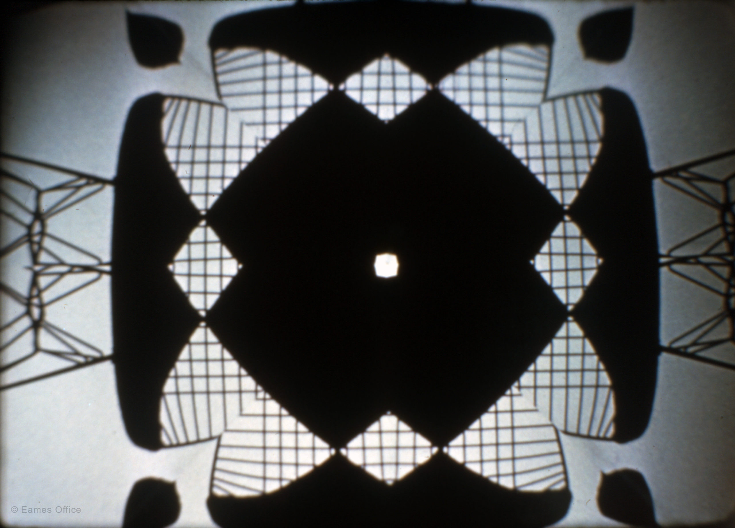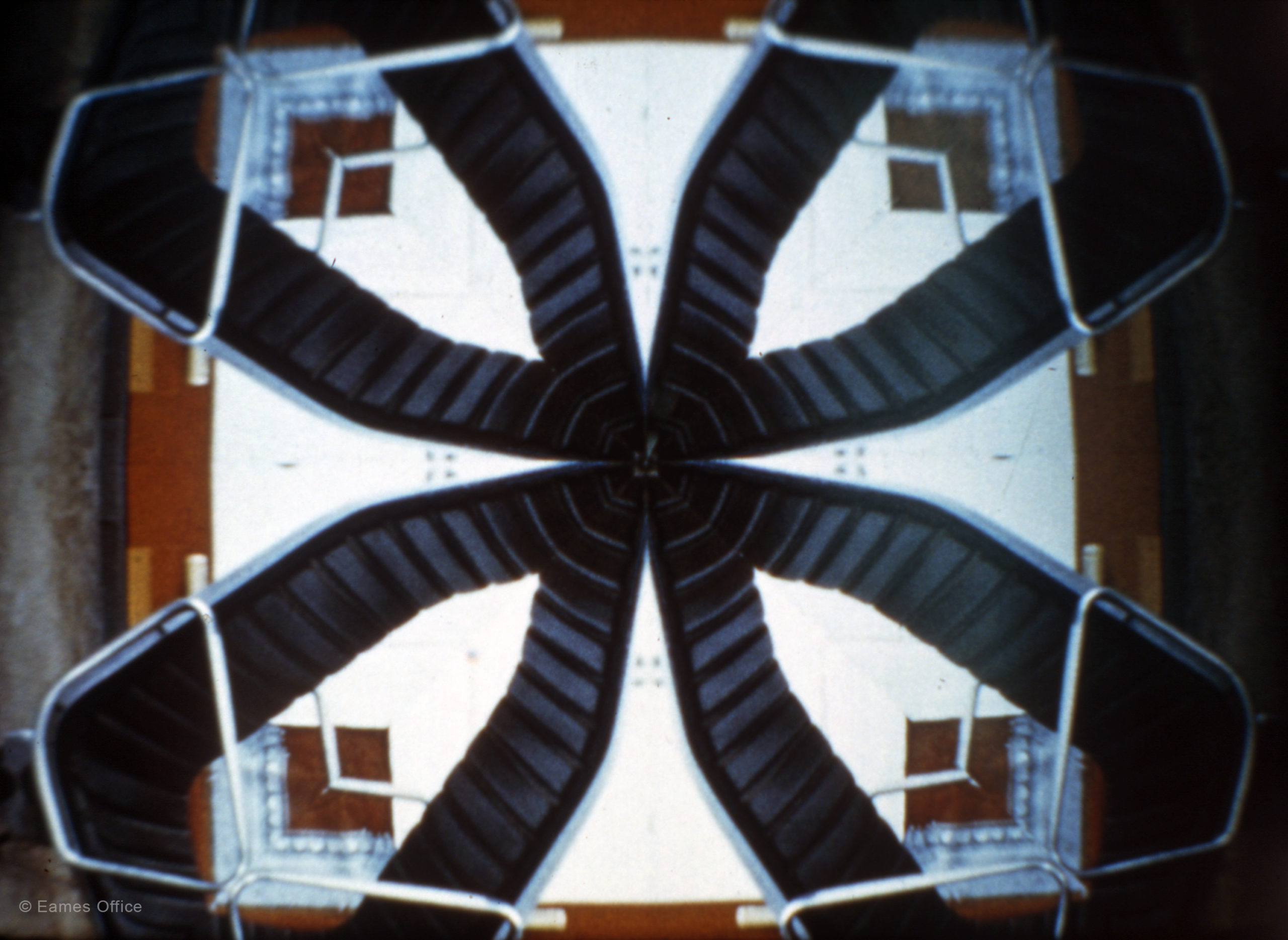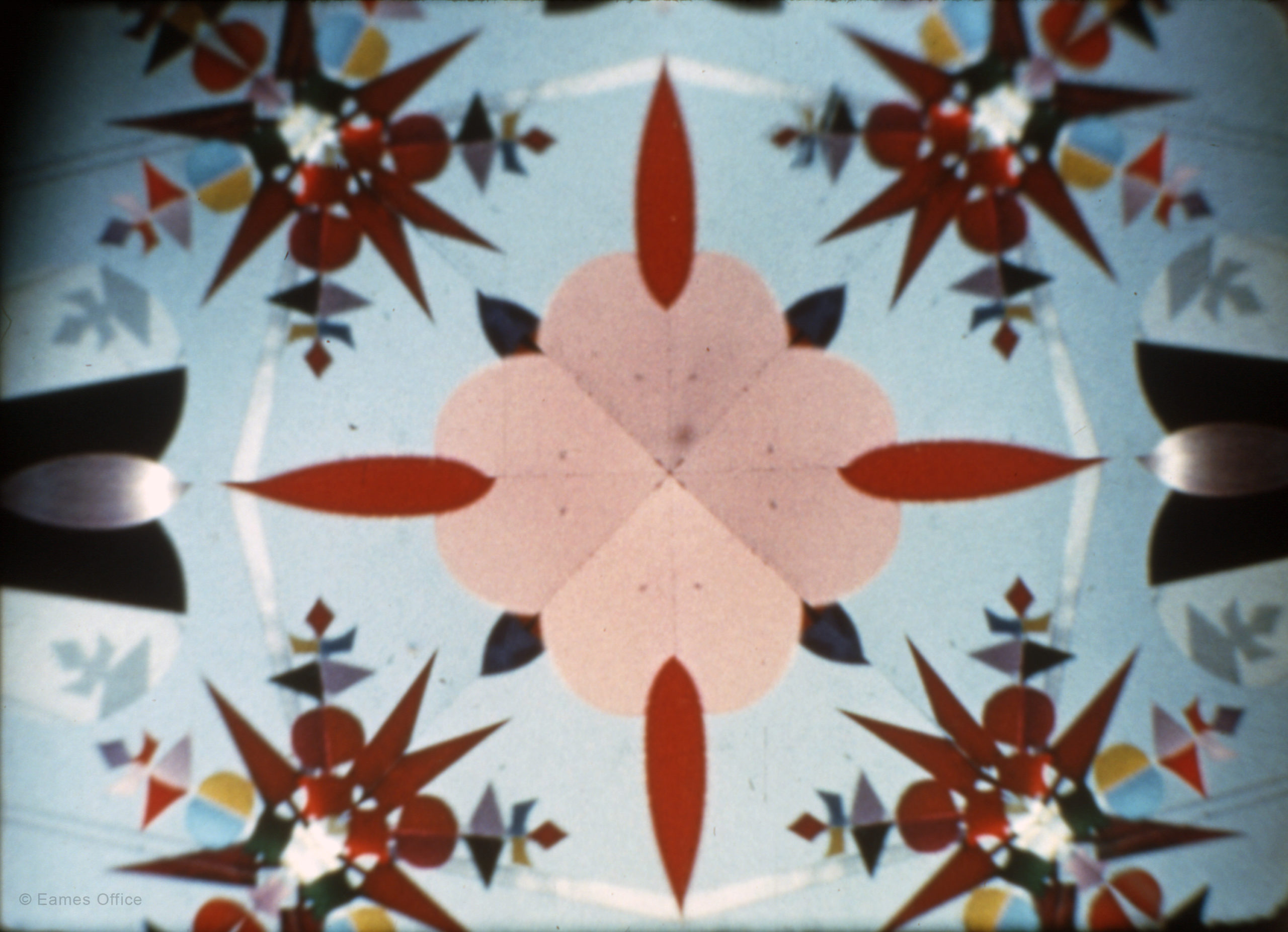 Photographed through a mirror system to achieve radial kaleidoscopic images, the beginning portion of this film consists of fast-moving kaleidoscopic images of chairs, objects, and materials. In the second half, kaleidoscopic images of the Eames Office dissolve into a sequence of stop-motion shots of Charles and Ray seated in multicolored plastic chairs.