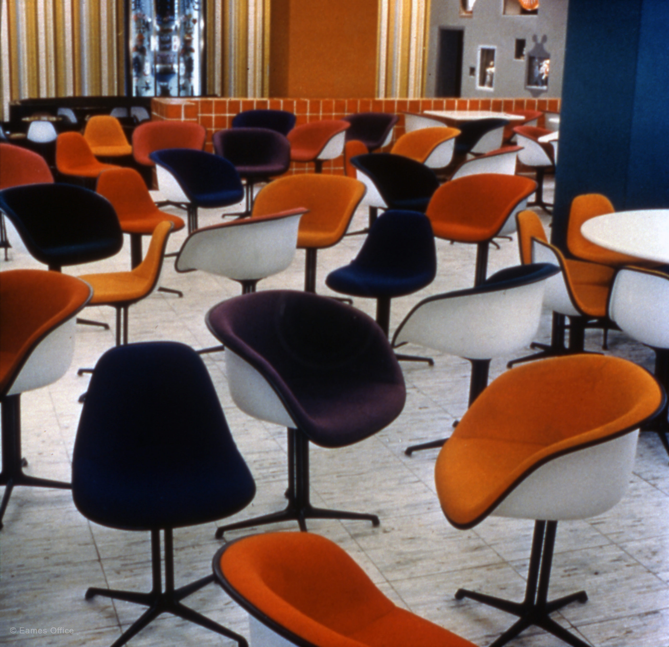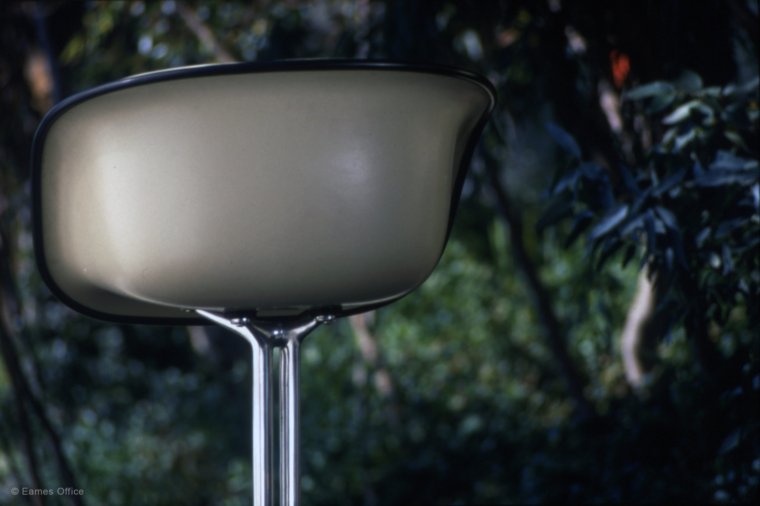 This arm chair is one of two new fiberglass chairs Charles and Ray Eames designed in 1961, inspired by request from Alexander Girard, who needed seating for his new Manhattan restaurant, La Fonda Del Sol. Some collectors call these “La Fonda” chairs after the restaurant where they were first installed.