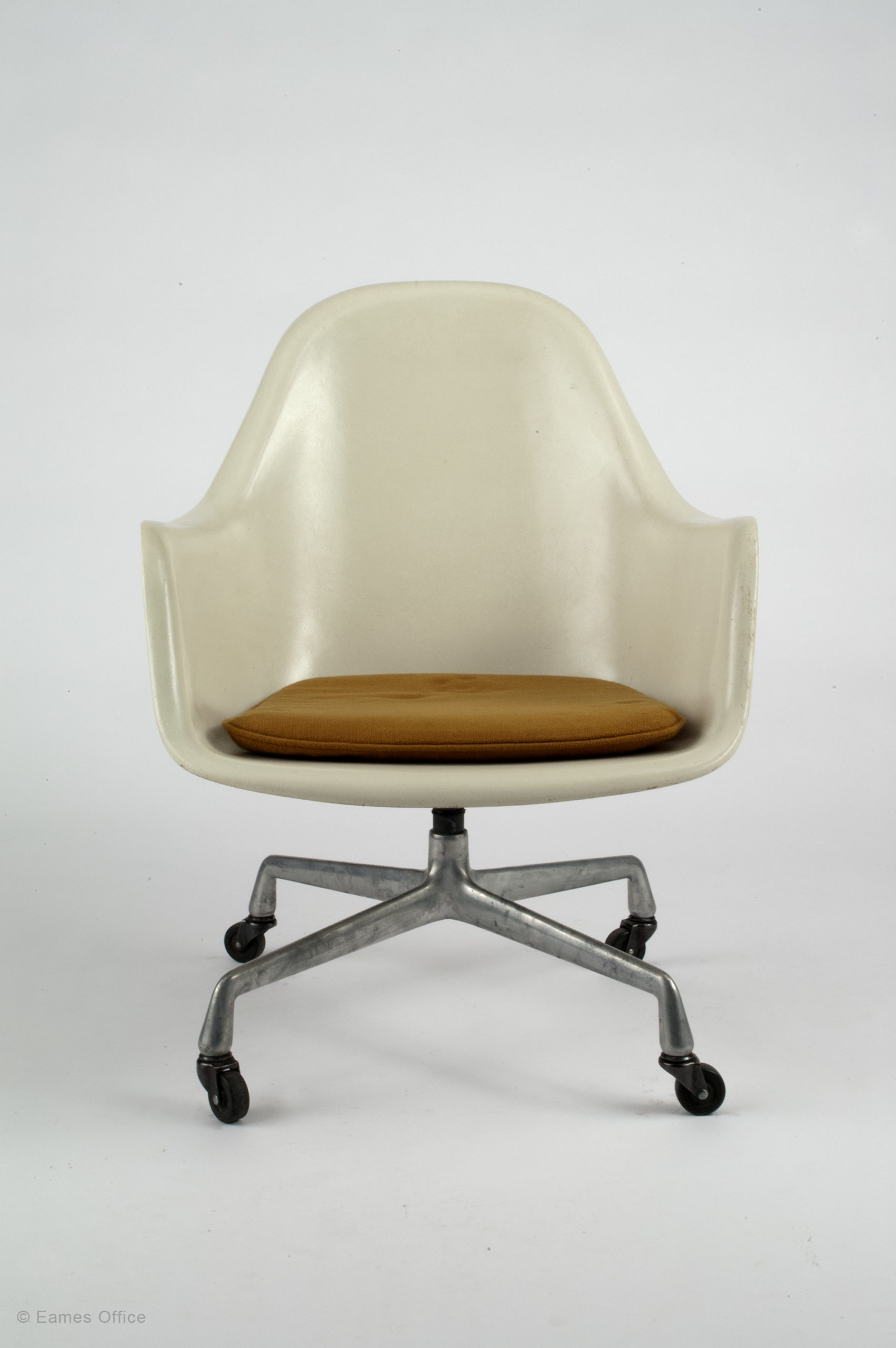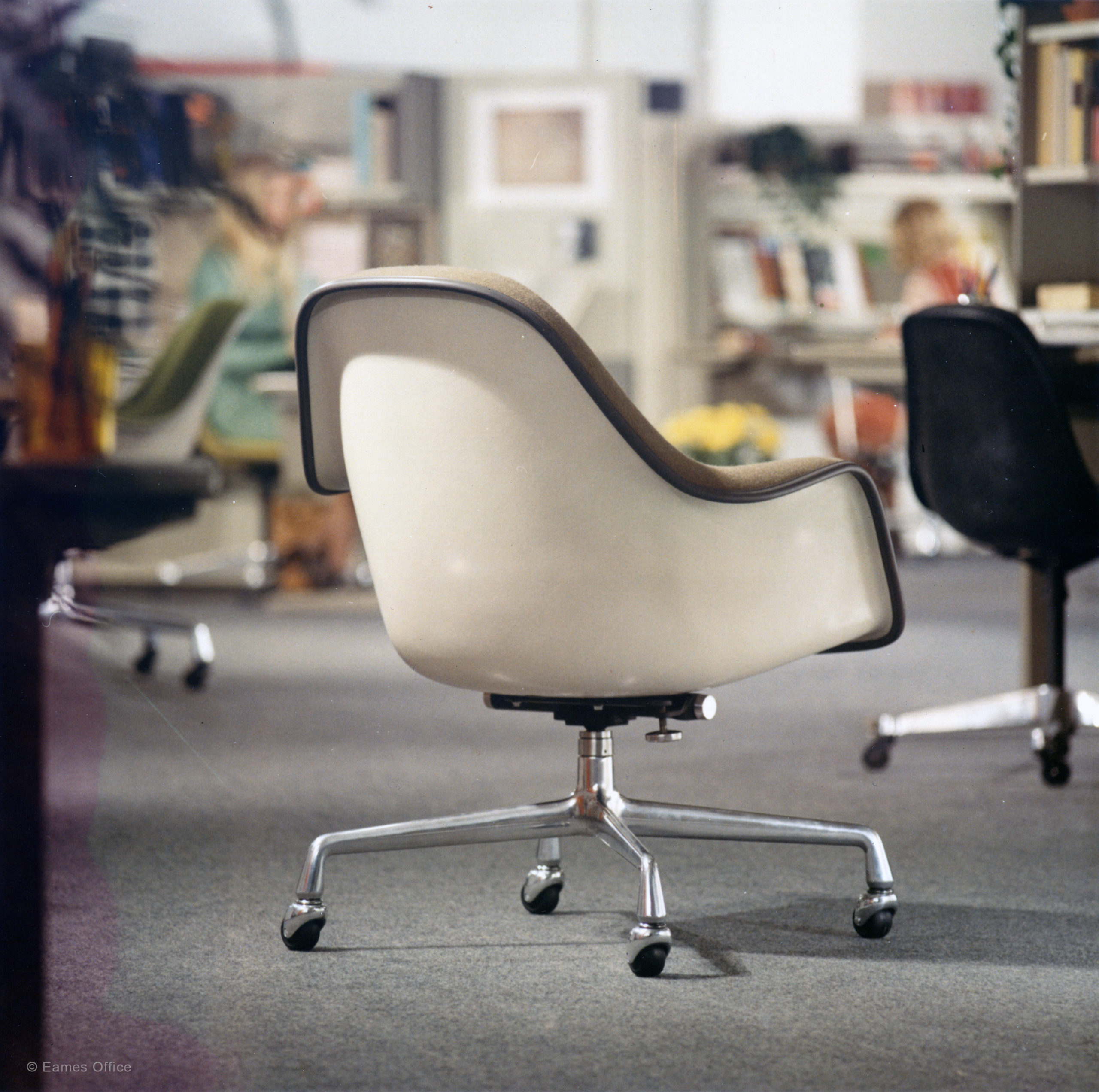 The padding varies in thickness from 3/4″ to 3″, and the rolled edge of the shell suggests its mass. As in the upholstered side chair, a thick vinyl binding provides a strong outline, but in this case, it relates only marginally to the linear quality of the base, which is the shaped aluminum design called the Eames Universal base, which was by this time also used for the office’s Eames Aluminum Group and Eames Soft Pad Group, Executive and Shell chairs.