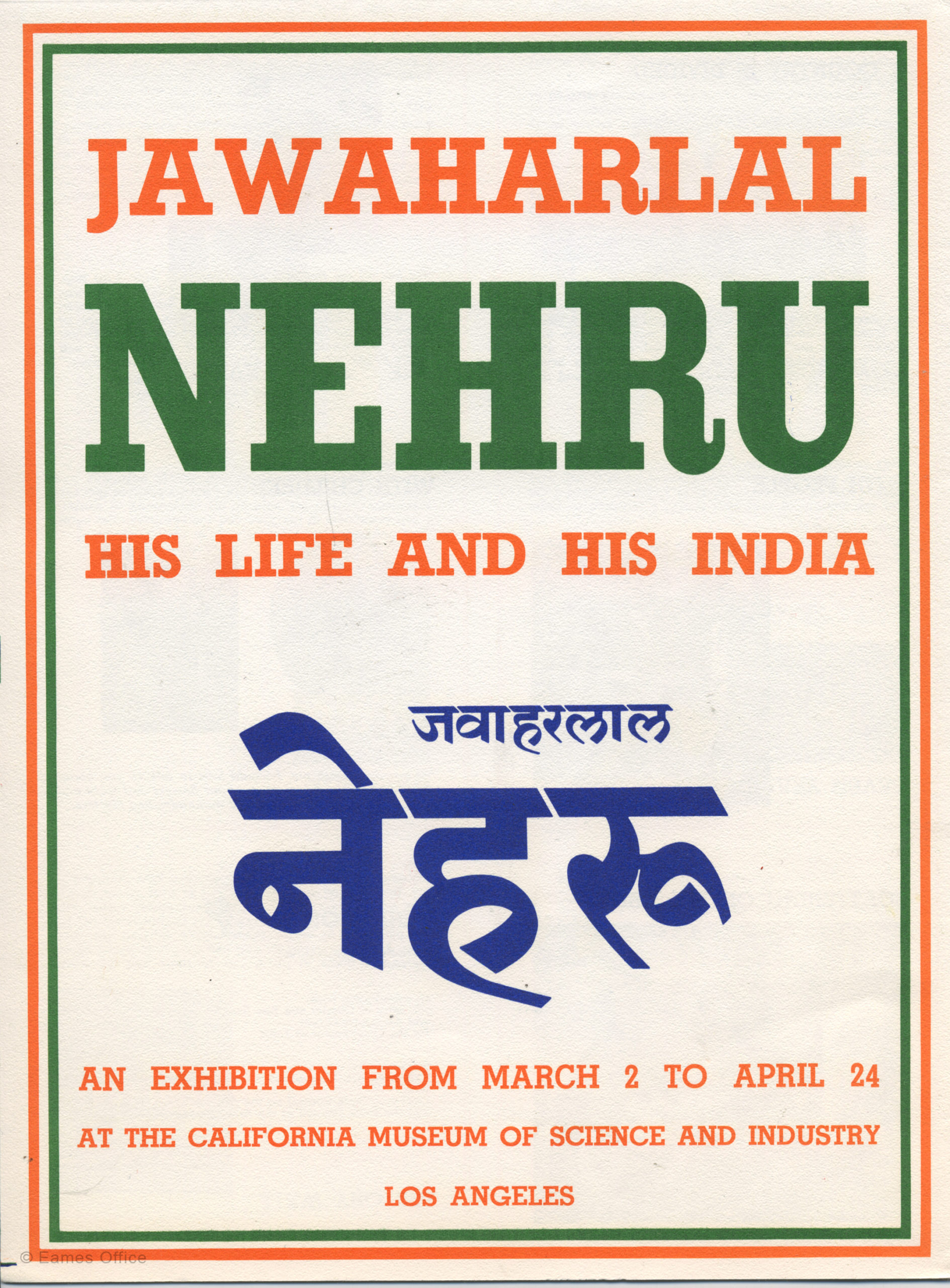 The Eames Office designed this exhibition poster and signage to accompany Nehru: His Life and His India. The show was created in collaboration with the National Institute of Design at Ahmedabad, which Prime Minister Nehru established at Charles and Ray’s suggestion after the couple toured his country and wrote The India Report.