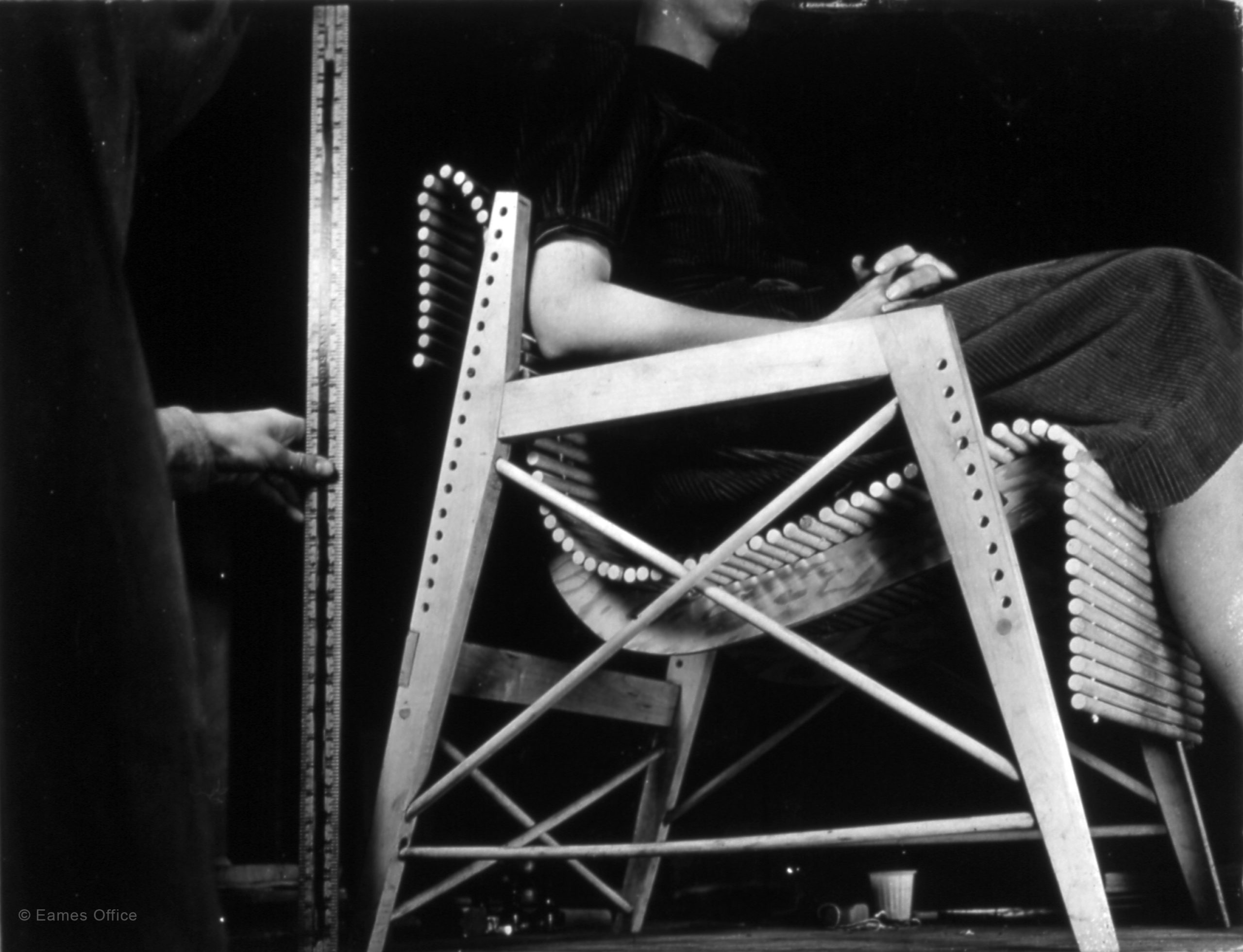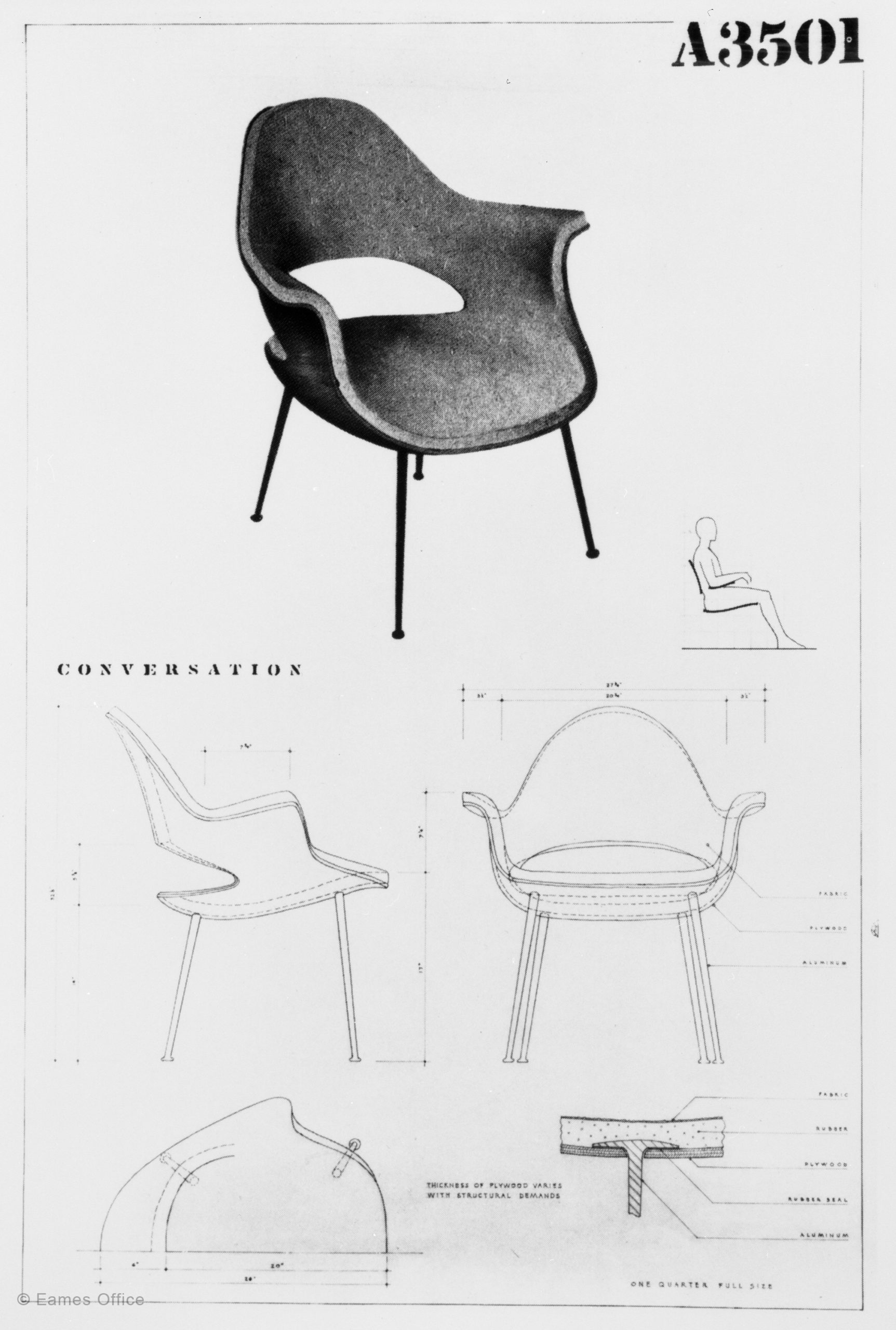 Best friends and fellow architects, Charles Eames and Eero Saarinen won the first-place prize in both seating and case goods in the 1941 Organic Design for Home Furnishings competition at the Museum of Modern Art. They created their “Organic Designs” in response to the competition brief, written by then MoMA Curator of Industrial Design Elliot Noyes. In his 1940 press release calling for competitive entries, Noyes wrote: “In the field of home furnishings there has been no outstanding design developments in recent years. A new way of living is developing, however, and this requires a fresh approach to the design problems and a new expression. An adequate solution which takes into consideration the present social, economic, technical and esthetic trends is largely lacking.” It went on to point out that the young designers who might conceivably address these issues worked at a considerable disadvantage because “they have not opportunity to form the contacts with industry which would enable them to have their designs produced.” The competition addressed this. Several manufacturers agreed to produce the prize-winning designs, and a consortium of retailers (led by Bloomingdale’s department store in New York) agreed to sell them. Thus, the winner of the competition would have guaranteed distribution. The contest drew over 1,000 entries and captivated minds around the country and was received most enthusiastically at The Cranbrook Academy of Art. Charles was then head of the Industrial Design department. The school was run by architect Eliel Saarinen, aided by his son Eero Saarinen, also an architect and Charles’s best friend. Thick cushions or springs and wads of stuffing were used with most furniture of this era, and the chairs had little flexibility. Charles and Eero’s big idea was to apply what Charles would call “an architectural solution” to the problem of seating. To apply architectural thinking meant that they would shape the chair to provide support and thereby do away with the need for thick padding. They conceived of plywood shells, molded with compound curves, and to provide the desired height, thin aluminum legs. The legs would be attached to the plywood shells by rubber shock mounts, inspired by the rubber shock mounts of car engines. The molded wood shells gave support to the sitter, the rubber shock mounts gave the chair flexibility for added comfort. The designers hoped to make the shell’s compound curves as uniform as possible and create them in the wood itself. Ray Kaiser (soon to be Eames) was on the scene at Cranbrook, auditing classes. Ray helped some with the final presentation drawings. It was around this time that she and Charles began their personal relationship as well. He remembered that Charles would ask anyone in hailing distance to try the chair out. Charles would watch carefully to see how they were reacting and experiencing the chairs. In the end, Charles and Eero settled on four chairs and three tables, and five case goods. The entry, including drawings and photographs of the scale models, went off to New York. At the end of January, 1941, the announcement came: Charles and Eero had won first place in both seating and case goods! Though the form of the organic chair is the most arresting aspect of the chair visually and in terms of the mass production challenge, the judges cited another innovation which was the use of a flexible leg mount to provide a kind of springy feel. Now Eames/Saarinen team had to deliver, and so far, they had only plans and a few models. Their models and Charles’ photographs had been so persuasive that people asked if they already had full-blown chairs–which they did not. The chair mock-up took longer than expected, while tables and case goods proved to be less of a problem. But the chairs were a different matter. That same April the first wooden shell was finally created–to no one’s satisfaction. Eames and Saarinen had hoped to mass-produce the plywood shells, but the technology didn’t yet exist for this. When they attempted to create curves in the plywood, the standard industry furniture presses produced splintered wood. They hoped to allow the wood surfaces to be expressed, and to some extent, they achieved this with the back of the relatively simple form of the side shell chair. But the armchairs required too much molding than they could manage, and they ended up covering the glued-up plywood shells with upholstery on the front and back. Restrictions on materials imposed by a government readying itself for what became World War 2 meant that the thin aluminum legs had to be replaced by thick, solid wood dowel legs. Even with these enforced compromises, the Organic Design seating was surprisingly lightweight, especially when compared to traditional upholstered furniture.