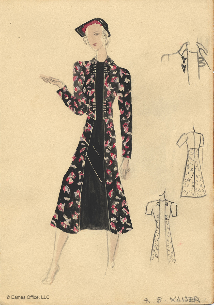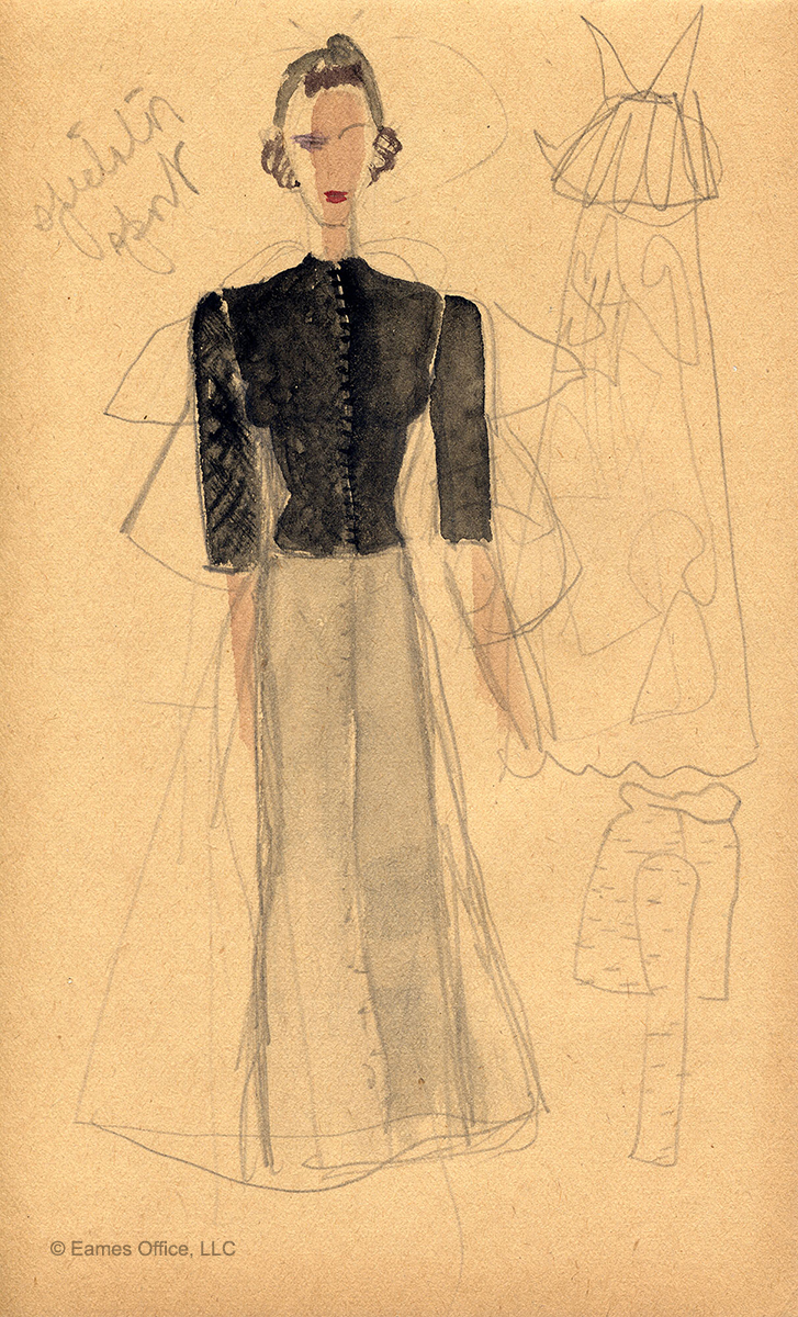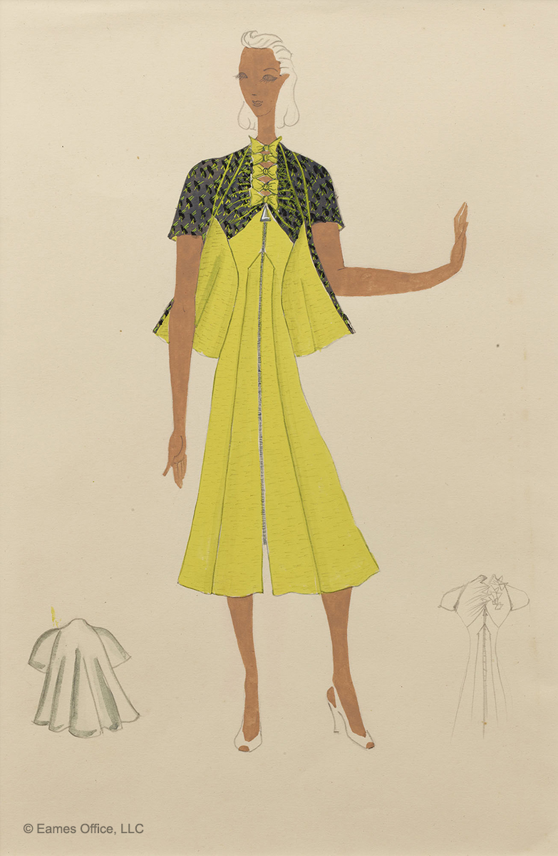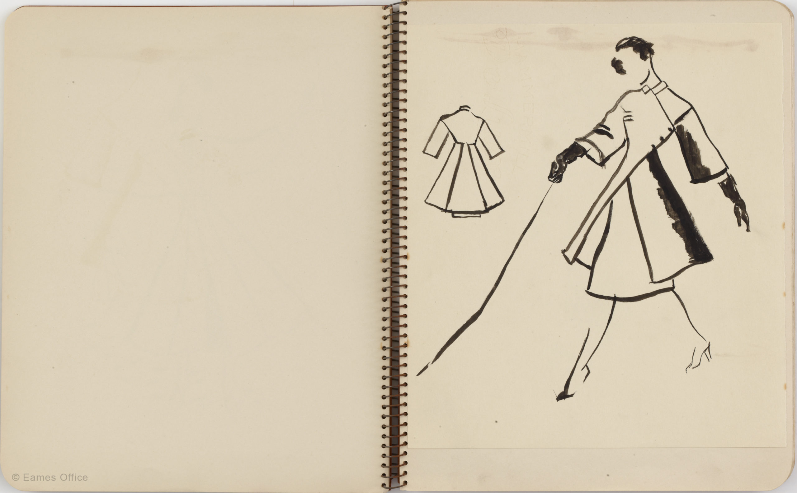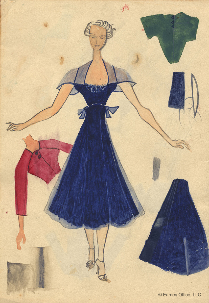 Ray’s early hands-on experience with fashion contributed to the Eames Office’s later work—not only as an exemplar of their iterative process, but also more literally. Ray designed textiles, clothing for herself and Charles, choir robes for a church, and uniforms for staff members of IBM’s Pavilion during the 1964 New York World’s Fair.