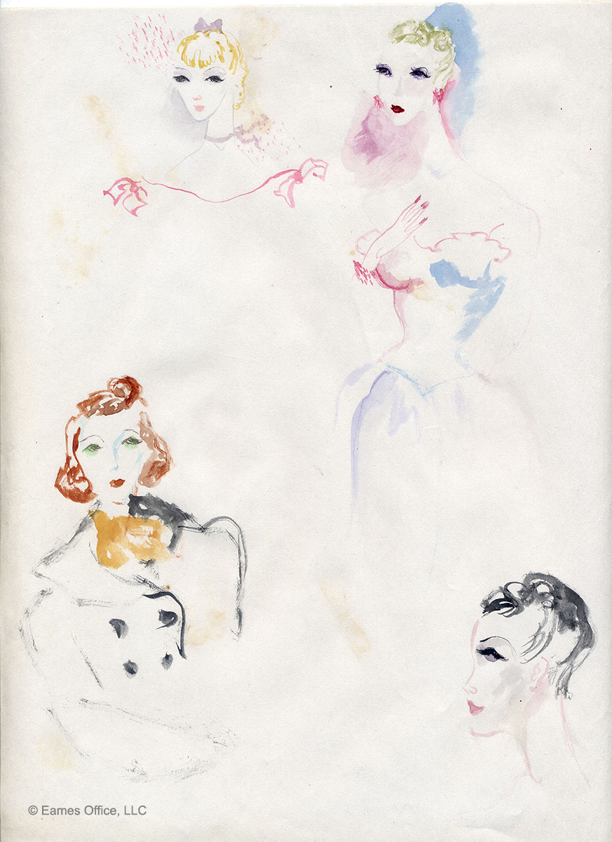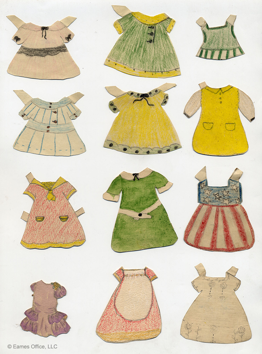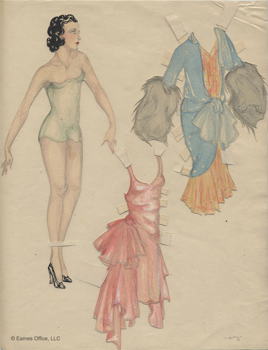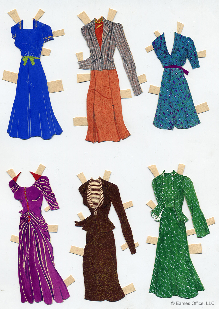 Ray’s early hands-on experience with fashion contributed to the Eames Office’s later work—not only as an exemplar of their iterative process, but also more literally. Ray designed textiles, clothing for herself and Charles, choir robes for a church, and uniforms for staff members of IBM’s Pavilion during the 1964 New York World’s Fair.
