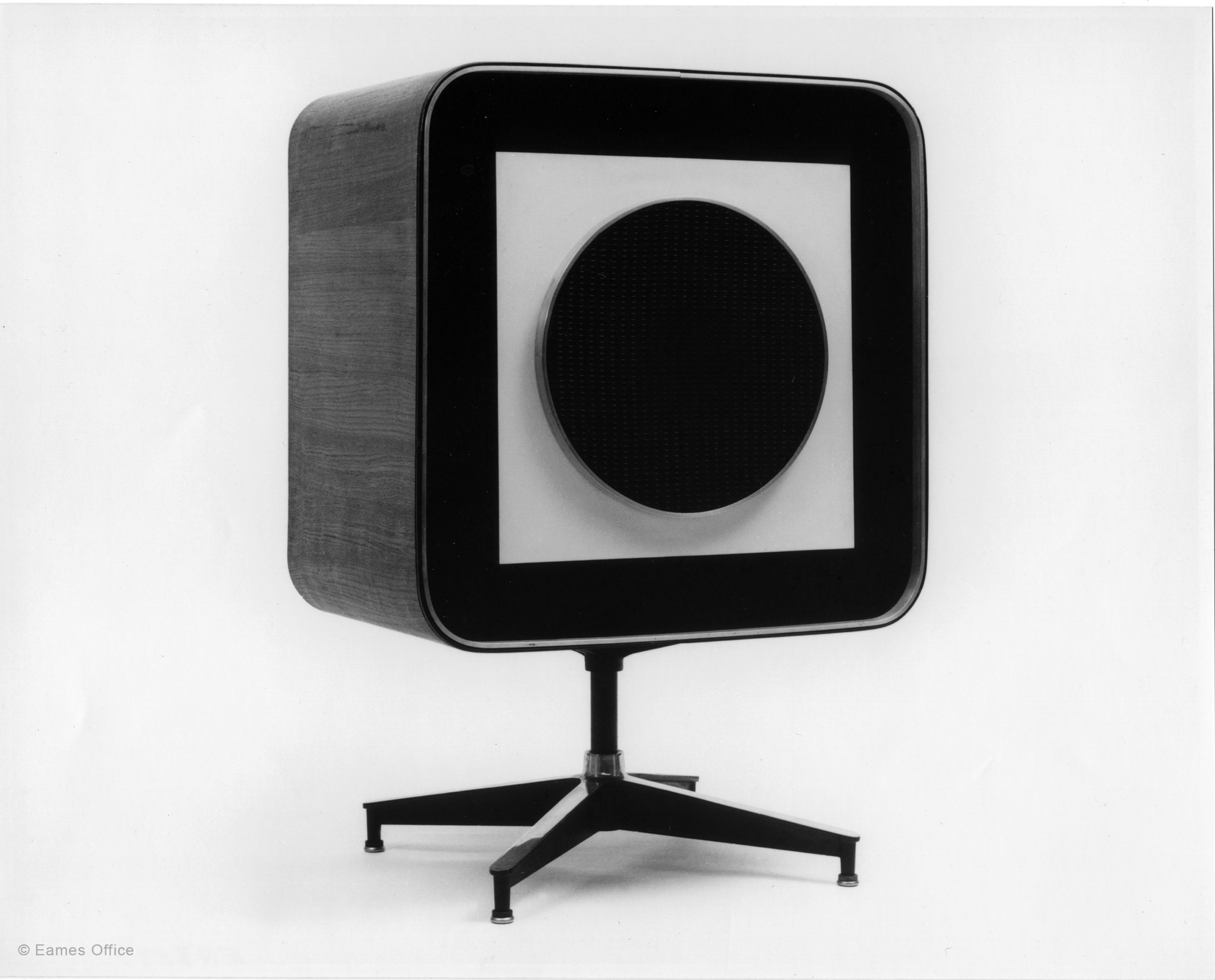 The “Quadraflex Speaker,” was selected as the production model. The speaker, set into the center of a square wooden case, incorporates a cast aluminum pedestal base, identical to the base used on the ottoman for the lounge chair.
