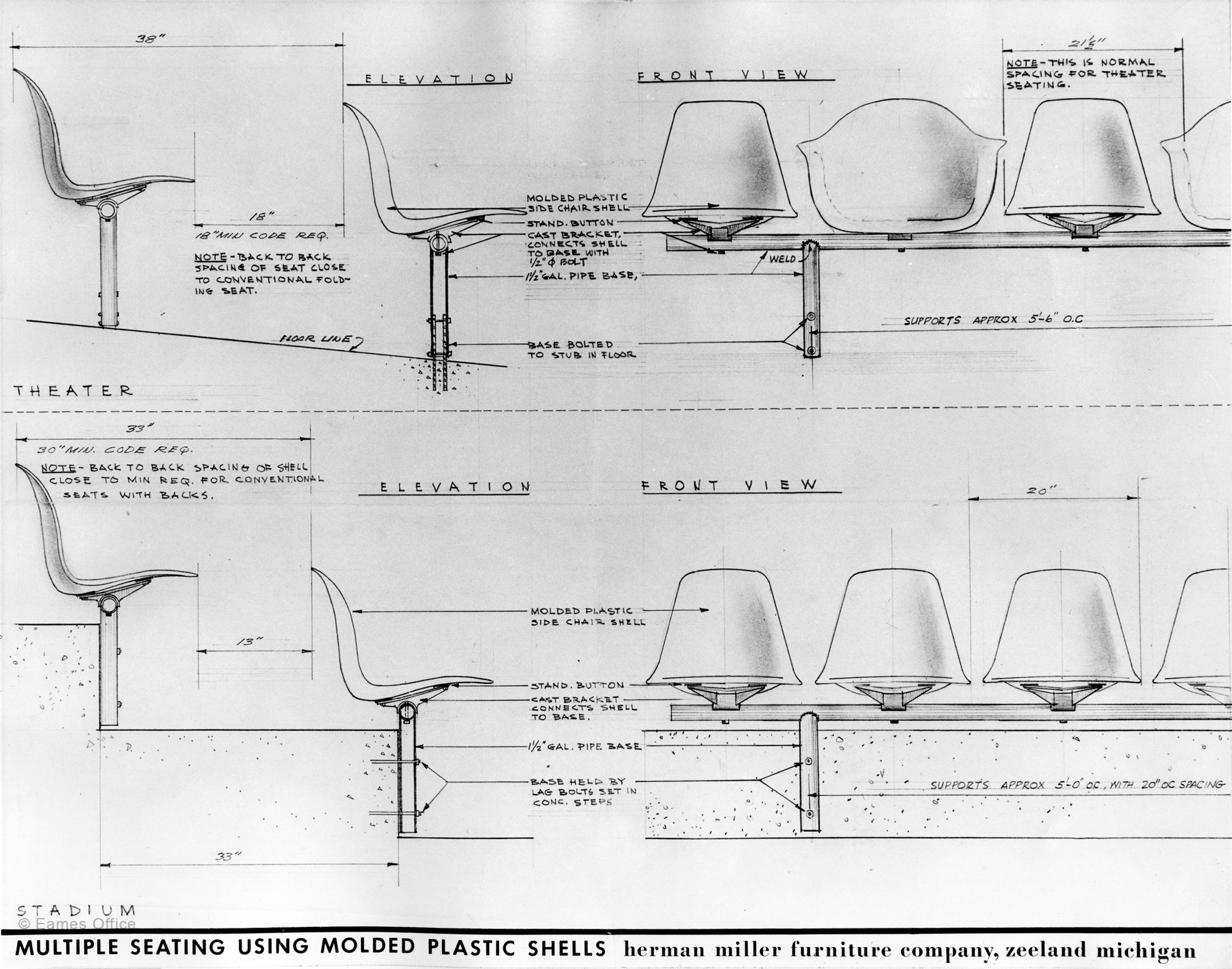 “Occasionally, we work on a piece of furniture without any specific application in mind—but that is the exception. Usually, the development of a design is triggered by some real and immediate need—a need of our own, or that of a friend, or a building or a situation. In the case of Tandem Seating, C.F. Murphy Associates, via O’Hare Airports, provided the trigger. Our response could not, however, be completely impersonal—not with the amount of air travel we do these days.”The Eames Office partner, Herman Miller, gladly provided the money for development. By this time, long time founding chairman of Herman Miller, D J DePree had retired, and the company was run by his son, Hugh De Pree. In the same interview, Hugh explained the technical aspects of the work: “Upon completing a mock-up, then a prototype, the Eames Office put the seating through basic tests. Herman Miller’s Technical Center subjected this prototype to the following tests: a 100-lb padded weight was dropped in a 5-in. free-fall onto a seat pad 15,000 times; arm, seat, and back-pad materials were subjected to 100,000 cycles on a Wyzenbeek abrasive test machine; seat and back-pad material were chilled at -15F for 30 minutes, then folded and run through a wringer; seat and back-pad material were exposed t 120 hours of ultraviolet light, 65-70 percent relative humidity, and to 105F ambient temperature.” The exhaustive, accelerated testing the Eames design was given convinced the airport developers that it was very durable and would require little maintenance over years of hard wear and tear. Hugh De Pree came to the following conclusion: “Herman Miller did not analyze the market for public seating before deciding to produce this new seating group. …We are depending on the validity of the design and on the quality of its manufacture to create a demand for Tandem Seating.” The Eames Office used the O’Hare and Dulles Airport projects as prototypes for the entire program. Charles Eames concluded his interview with a very interesting observation. “Two gratifying things about the project can be directly attributed to the architects: the architectural background within which the seating worked was sound and consistent; and the architects were content to consider black as a color.” Carter H. Manny, who supervised the project for O’Hare Airport, summed up their decision to adopt the Eames design: “Eames Tandem Seating was finally selected over the other submissions because it met our requirements more than any other design. It was easily as comfortable, perhaps even more comfortable, than units with conventionally upholstered seats and backs, yet the back and seat in this Eames design are simple reinforced pads, identical, interchangeable, and capable of quick-low-cost replacement. This replacement factor was also constant for the polished, cast aluminum legs and frames, which are assembled with mechanical joints. It was a key factor in deciding on the Eames unit. None of the other designs submitted had such a feature.” We’re not aware of any other airport seating that ticks all of the boxes. That’s why we call Eames Tandem Seating the best in airport seating. Hundreds of airports around the world provide Eames Tandem Seating to their guests, and it is suitable for many types of public places. Some Apple Stores have equipped their in-store theaters with ETS. The design is available in Europe and the Middle East from Vitra, and available in the United States and the rest of the world from Herman Miller.