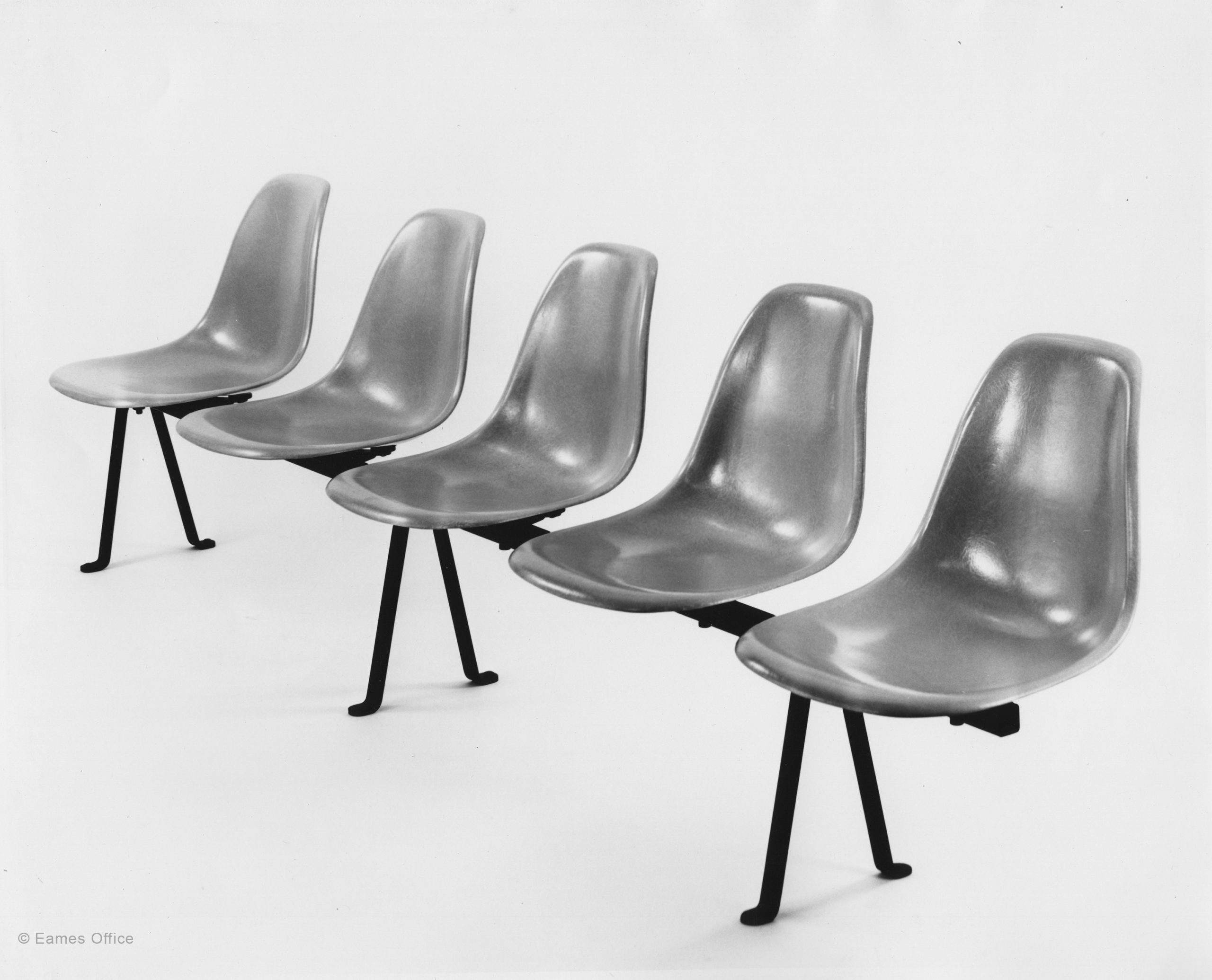 In 1961, two new terminal buildings were opened at Chicago’s O’Hare International Airport, and the developers of this airport needed new seating. Around the same time, long-time Eames friend, Eero Saarinen, also asked for new public seating for an airport he was designing, the Washington DC area Dulles Airport.  The Eames Tandem Seating was first installed at these two airports, but they have been made available worldwide and are found in service at hundreds of airports.  Having already developed successful sling seating, in the form of the Eames Aluminum Group, which consisted of chairs for individuals, Charles and Ray Eames had already been thinking along the lines of developing public seating based on the concept of suspended upholstery.