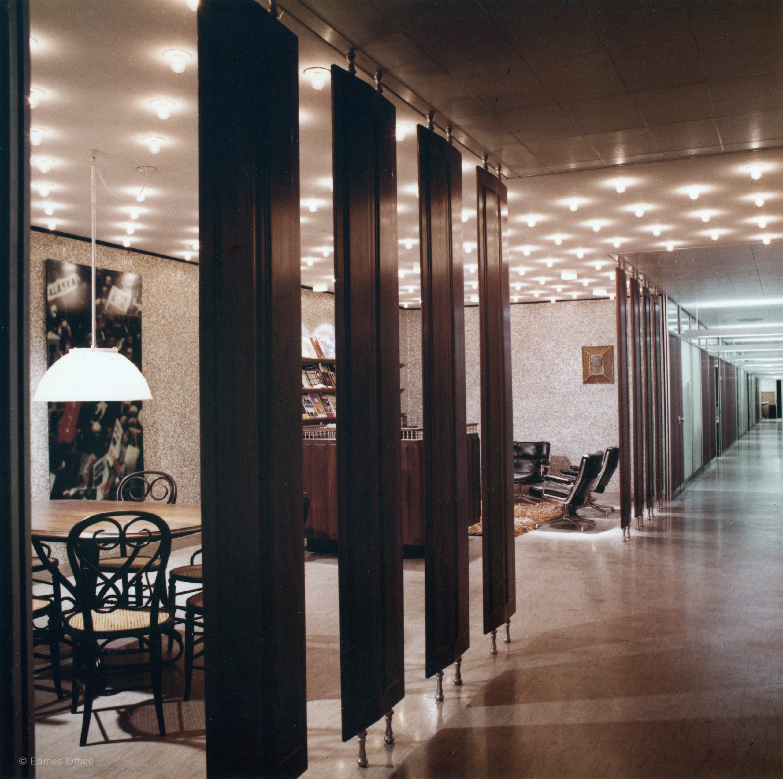 A year after the exhibition in Moscow, which was a great success featuring an impressive Eames multiscreen slideshow, Luce asked the Eames Office to design the lobby for the executive floors of his new building.