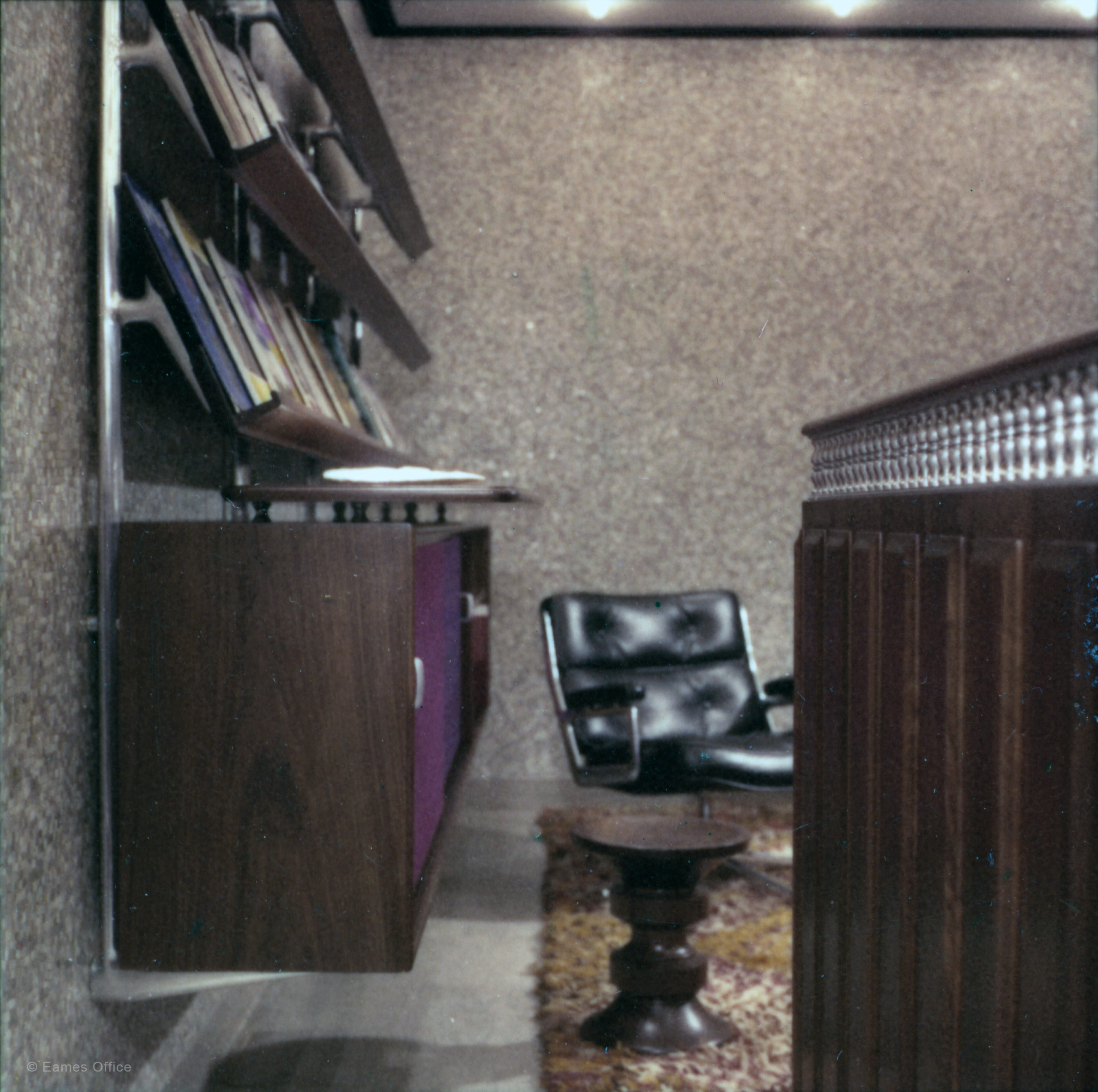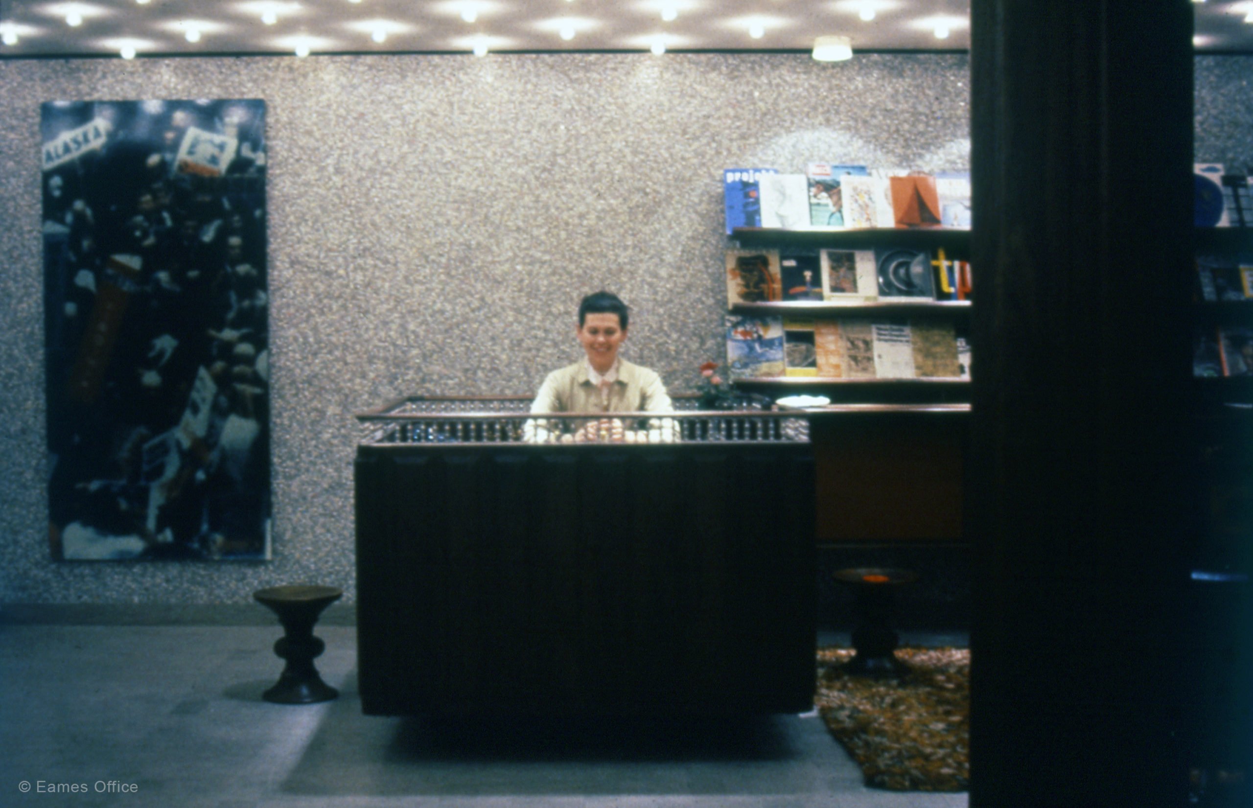 The Eames Office created the basic elements of the lobby, including a solid walnut reception desk, matching credenza, and a display bookshelf. Charles and Ray also responded with the Eames Executive Chair, in both lobby and desk versions, and solid walnut stools, which are still in production today from Herman Miller and Vitra.