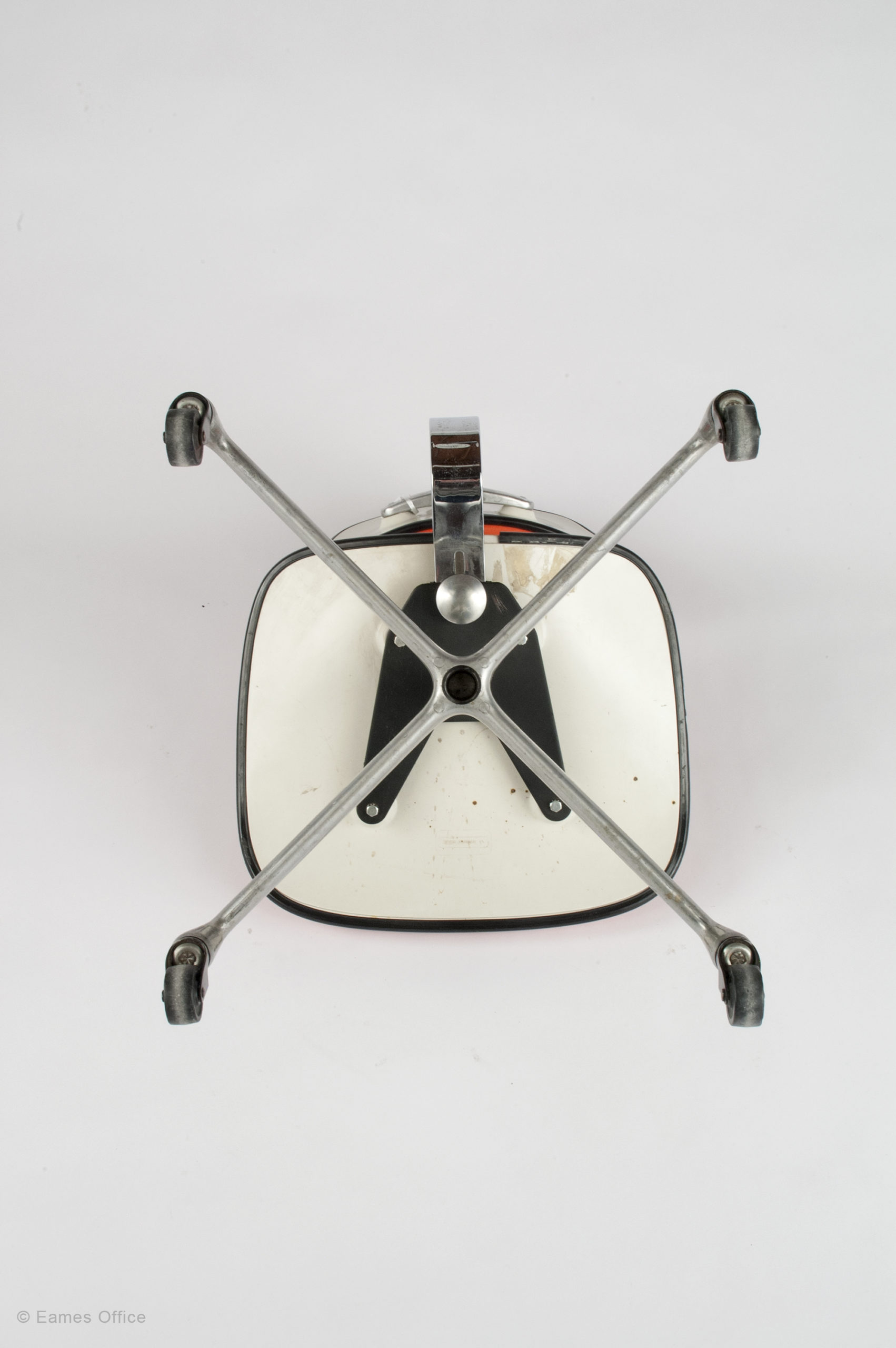 In 1970, the Eames Office developed two new designs for plastic chairs, using a new formulation of fiberglass that made it possible to make the chair seats and backs of plastic resin with the shock mount connection molded-in, instead of being applied after the molding process. The two-piece secretarial chair came in three versions, the EC 228, the EC 328, and the EC 428. The EC 228 and EC 328 were desk height chairs, with two different thicknesses of padded seat and back. The EC 428 was a drafting-height chair, and it came with a steel foot ring.