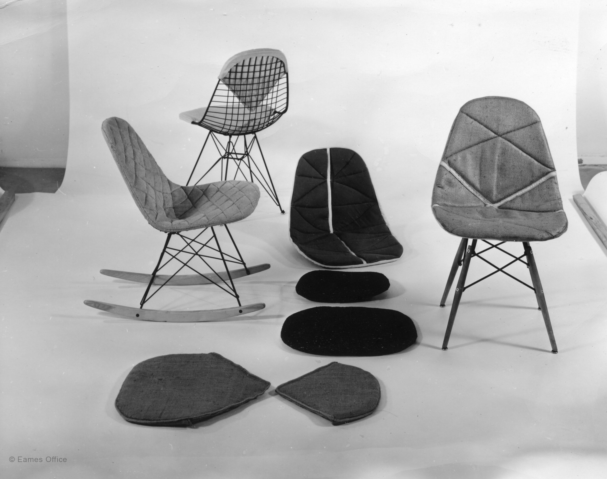 Long before “sustainability” became a watchword for consumers and manufacturers, in 1951, Charles and Ray Eames introduced comfortable, upholstered furniture with easily repairable, easily replaceable upholstery. The wire shell, the same form, and shape as the fiberglass side shell, was a structure to support the pads. The first pads developed were of one piece, covering the entire wire shell, and these were not inexpensive. Ironically, the version of these chairs that have proven the most popular, the two-piece pad chairs, which the public refers to as “Bikini chairs,” were originally developed as a lower-cost alternative to the full, one-piece pads.