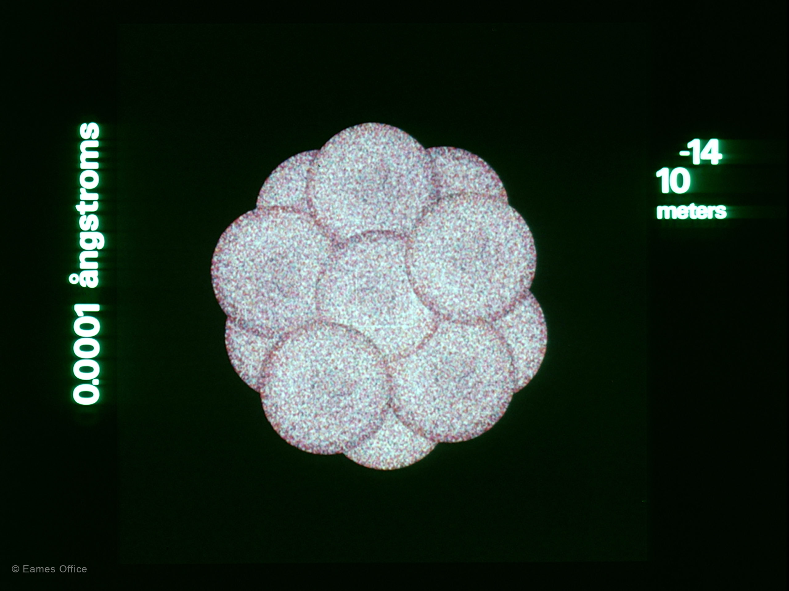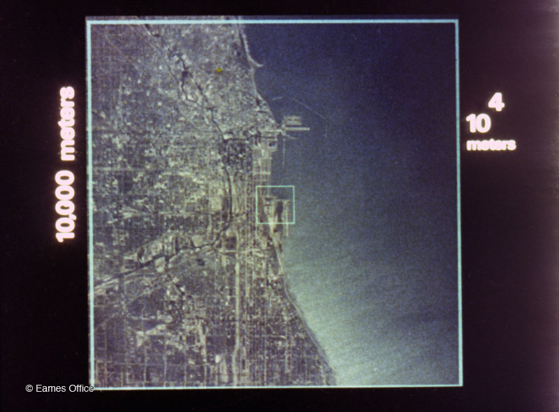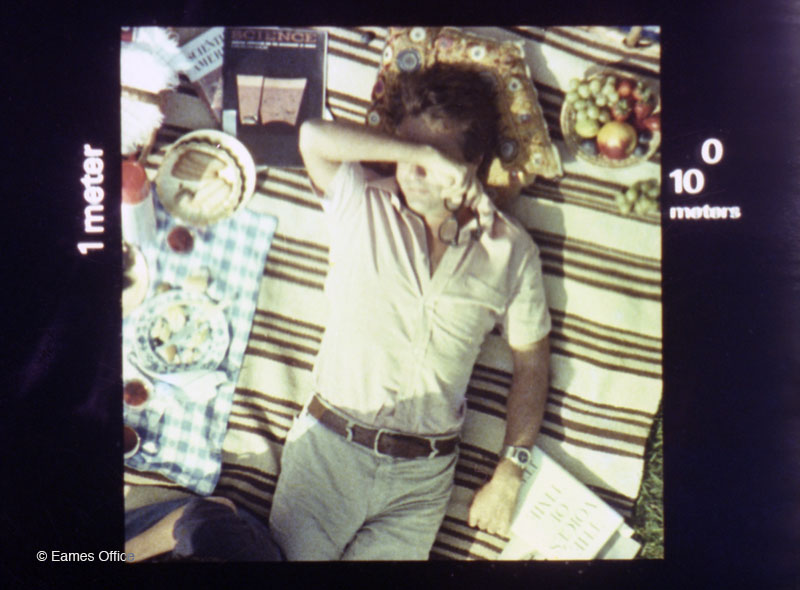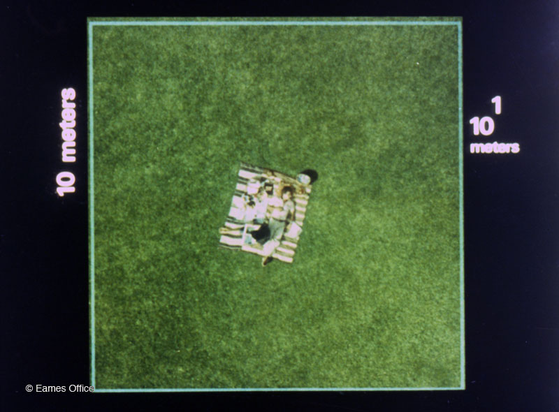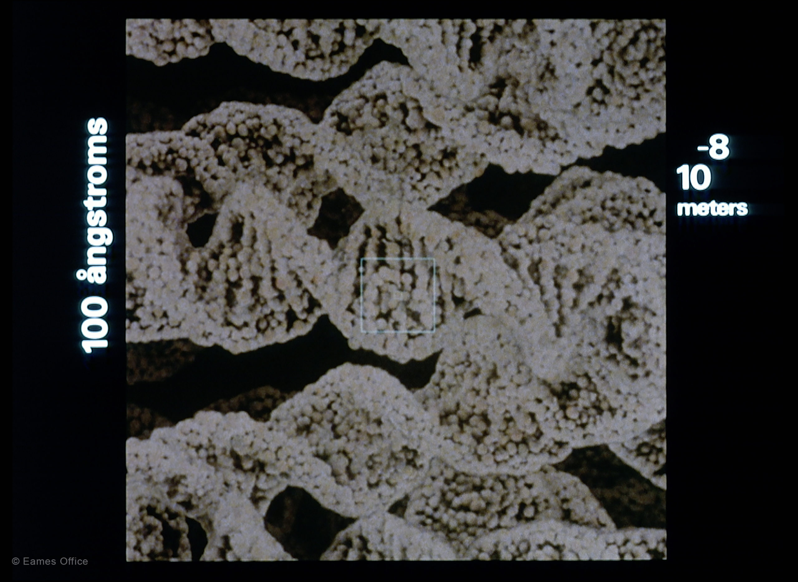 Powers of Ten is one of the Eameses’ best-known films. Since it was produced in 1977, it has been seen by millions of people both nationally and internationally. As with A Communication Primer and 2n (a 2-minute Peep Show from the exhibition, Mathematica), in this film, Charles and Ray employed the system of exponential powers to visualize the importance of scale.
