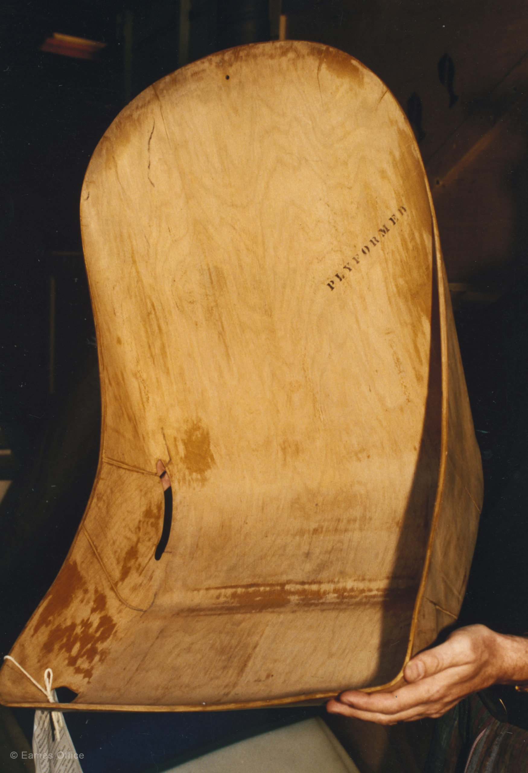 The book, An Eames Primer, asks its readers to look closely at the pilot seat in particular, because “In some ways, it solves the problem of the shell posed by the Organic chair: it is a single-piece plywood shell, but in order to make the material work, it had holes in the corners, and the veneer had to be applied unevenly. You can’t just put a stack of veneers on top of one another and mold them. They must have cuts and other details that make it possible to create the curvature.”