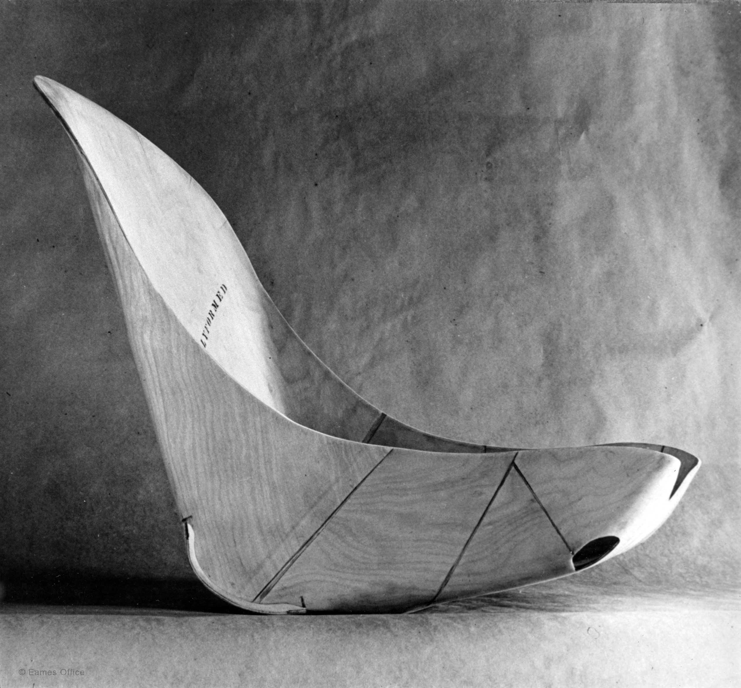 In 1942, the Eameses pondered how molded plywood could address a serious problem the Medical Corps was struggling to solve: The standard metal splints used to brace wounded World War II servicemen were causing further injuries due to the vibrations in the metal during transport. Within one year, Charles and Ray produced their first Molded Plywood Splint using a wood-bending contraption they invented known as the Kazam! machine .